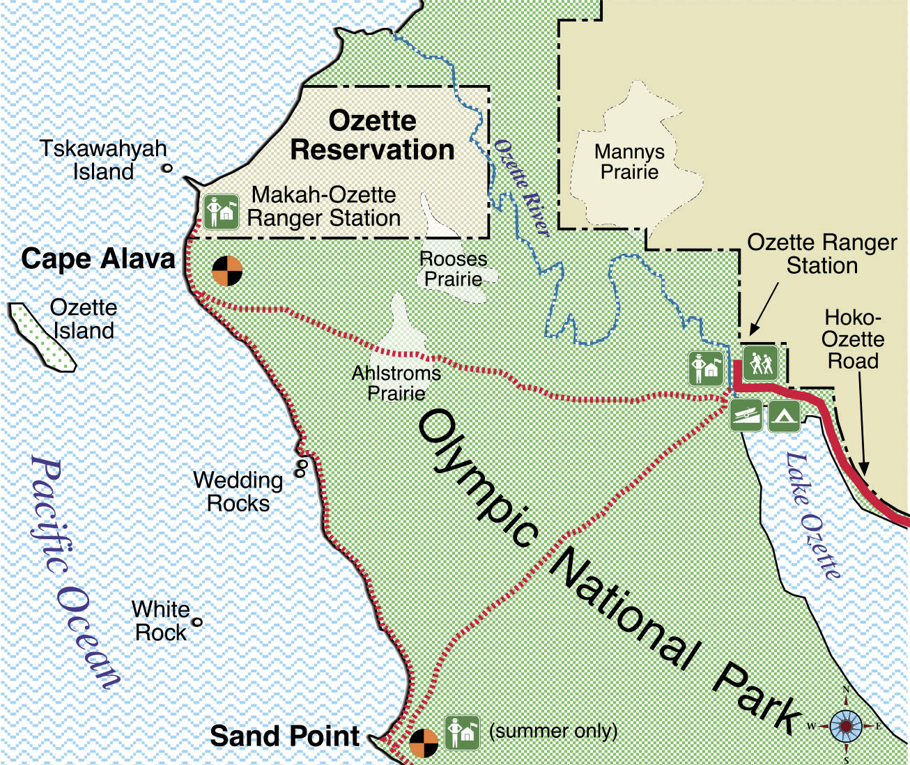 It is now within Olympic National Park’s coastal strip and can be accessed from a trailhead at the northern tip of Lake Ozette.