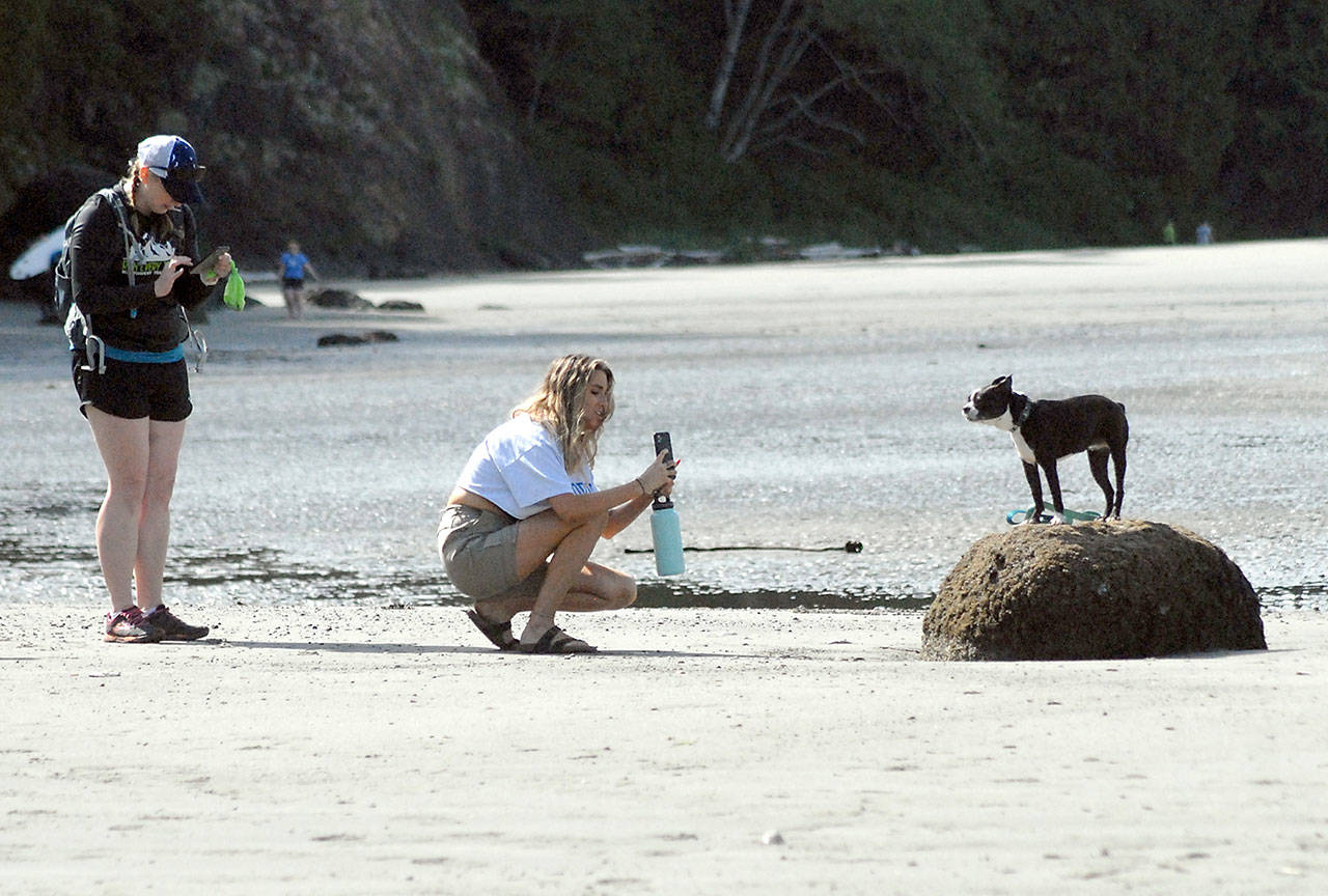 Caitlin Granade, left, and Gabrielle Thetford, both of Poulsbo, take photographs of Mango Salsa, a Boston terrier, on the beach at Salt Creek Recreation Area north of Joyce on Saturday, May 9, 2020. (Keith Thorpe/Peninsula Daily News)