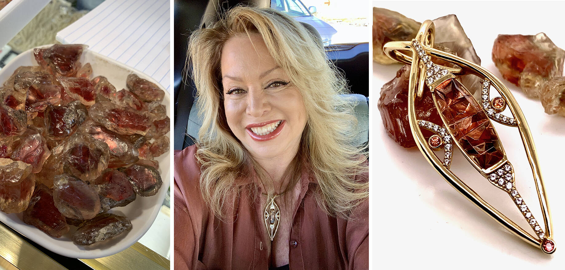 “All of the miners have special gems that they’ve pocketed. And they all know that I’m looking for the best. So when I visited Chris Rose, the owner of Spectrum Sunstone Mine, I asked him, ‘Are you hiding anything special?’ He gets this smirk, and pulls this Oregon sunstone out of his pocket — he’d been carrying it in his pocket for months,” Callahan says. “I gasped when I saw it.”