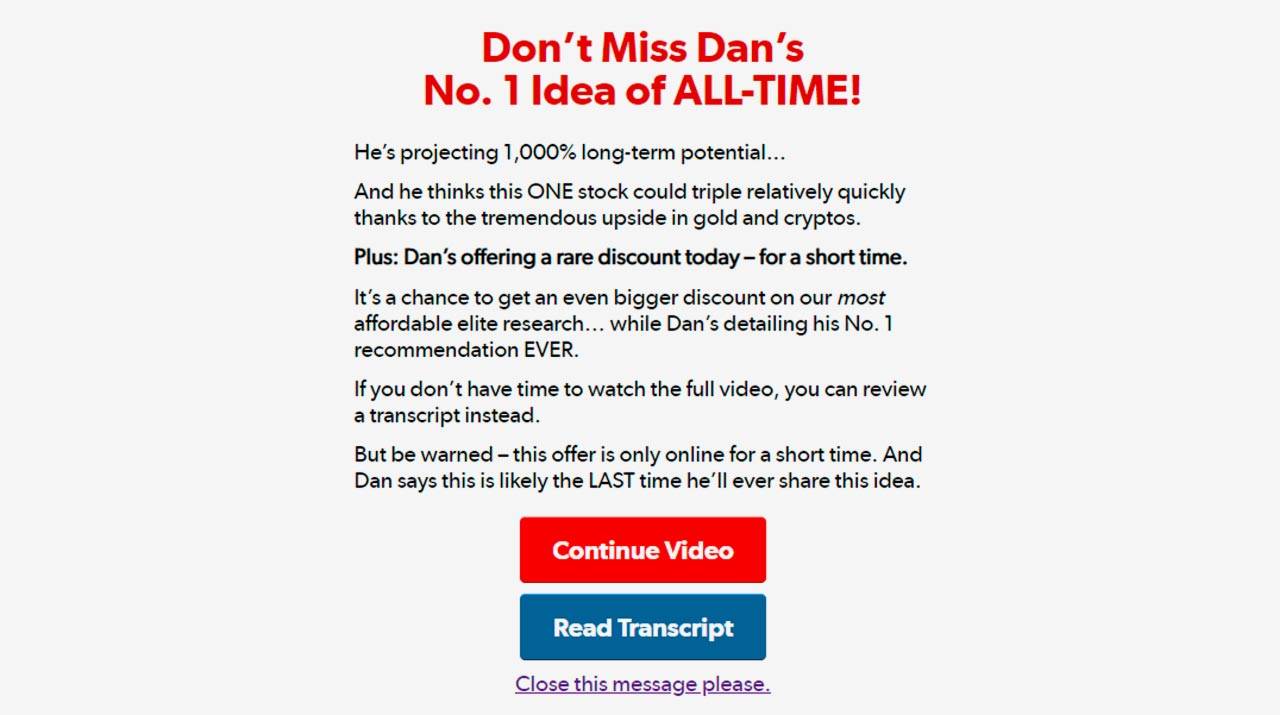 The Hands-Down No. 1 Pick of My Career: In this report, Dan discusses a gold-related stock that he expects to grow 1,000% or more in the near future. Dan claims if he had to invest all his money into one stock today, he would pick this one. He’s extremely confident about this stock, claiming it provides enormous upside with little risk. The company earns revenues based on the demand for gold. It’s not a miner, explorer, or producer, but Dan believes it will still rise in value as gold gets higher.