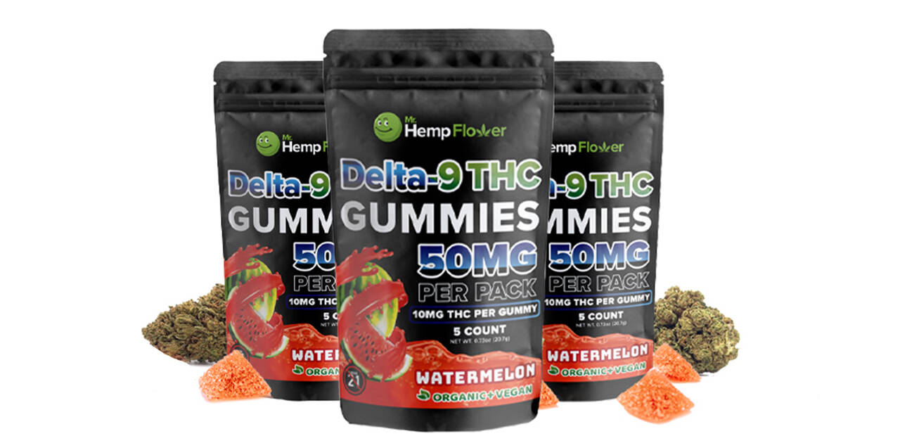 Gummies from brands like Mr. Hemp Flower are made with all-natural ingredients and sold in packages with 5 gummies each for a total of 50 mg of delta-9 THC.