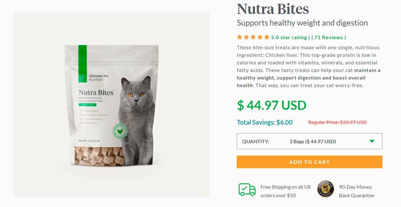 For a 71g-bag of Nutra Bites™, pet owners can expect to invest USD $44.97, which has been reduced from an original price of USD $50.97. This price excludes shipping and handling. Speaking of, free shipping is offered on all U.S. orders over
