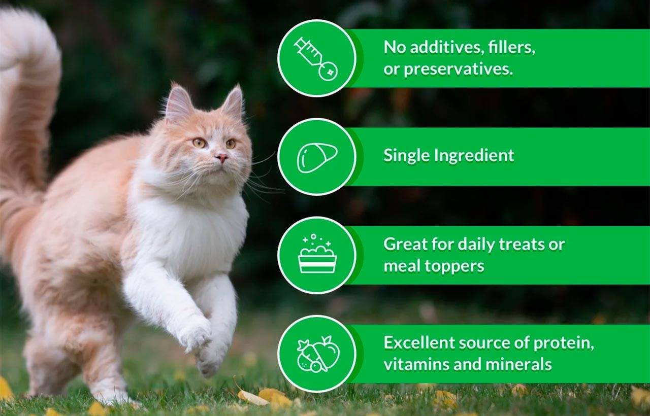 As its name would suggest, Nutra Bites™ are bite-sized cat treats that aim to deliver essential vitamins, minerals, and fatty acids for optimal wellness. Each serving is deemed free from additives, fillers, and preservations contain a single ingredient and can be used as either a treat or a meal topper. The secret to the Nutra Bites™ is supposedly simplicity, which allowed the creators, Ultimate Pet Nutrition™, to develop a snack that only celebrates a high-quality protein source in its natural form. Now that the basics are covered, let’s dive right into the ingredient list.