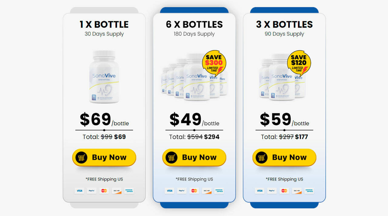 SonoVive is priced at $69 per bottle, although the price drops to $49 or $59 per bottle when ordering multiple bottles.