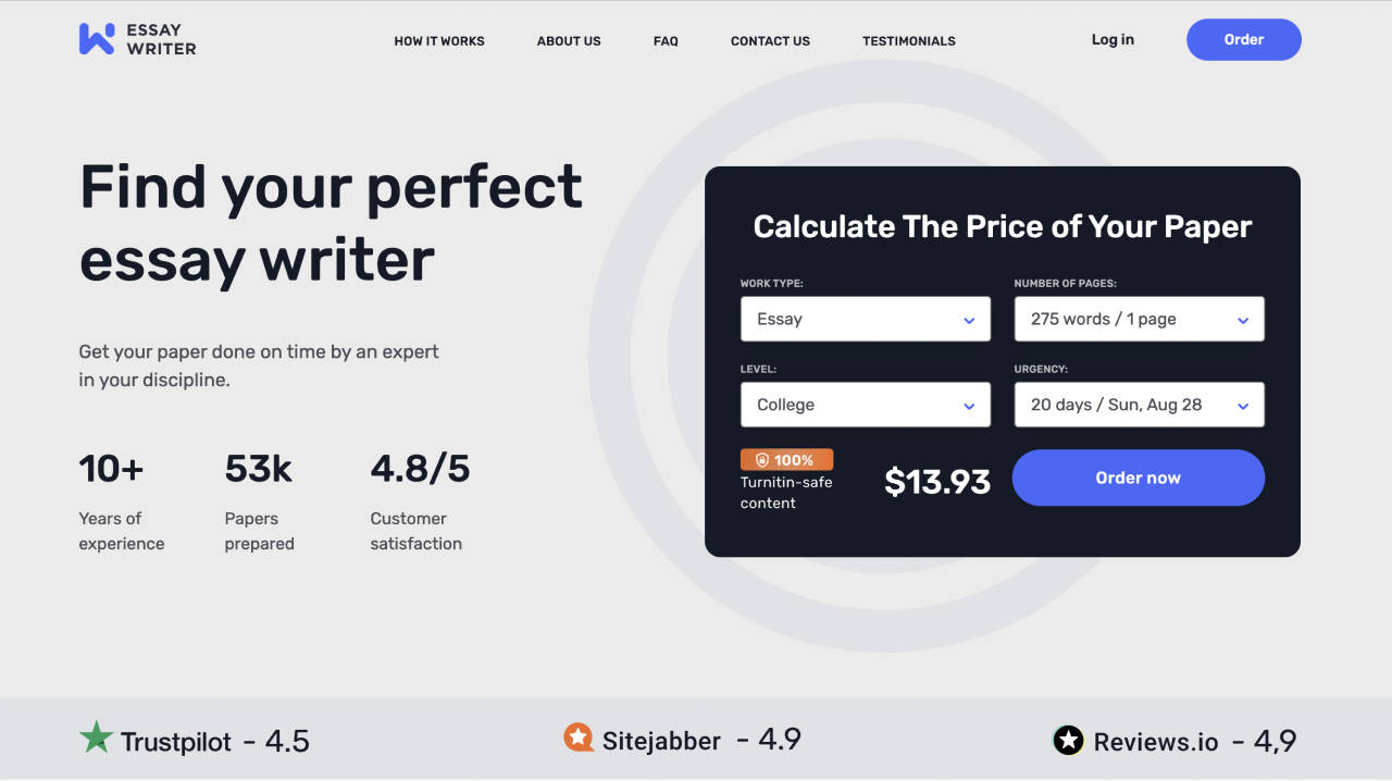 Finding seasoned, qualified essay writers is not easy today, but EssayWriter has made it. The star team of this company has been standing by students’ interests for over a decade. Its track record exceeds 53k papers, and the 4.8-star customer satisfaction level needs no further commentary.