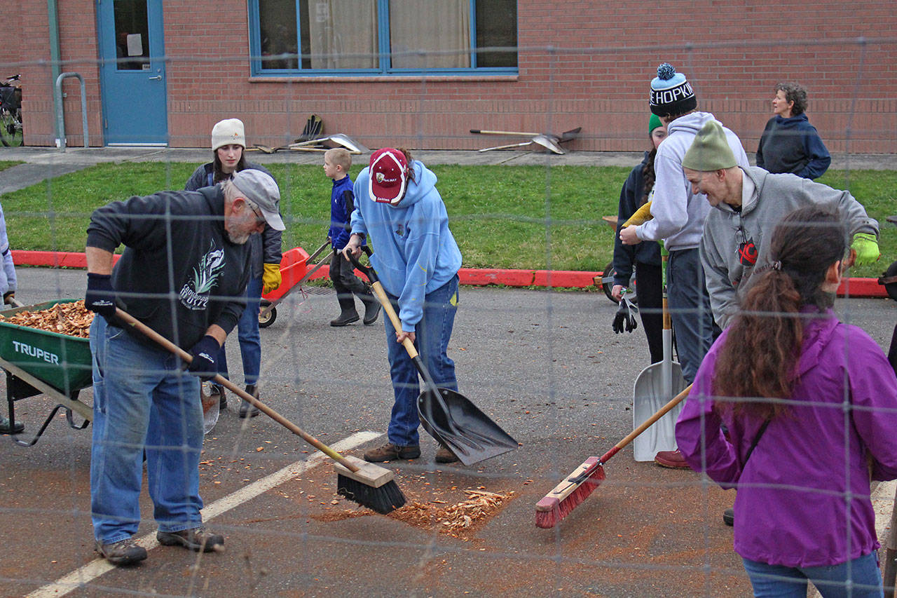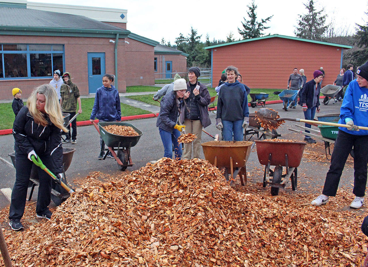 PORT TOWNSEND — About 100 people got their hands dirty at the Blue Heron Middle School orchard, laying more than 50 yards of mulch around the orchard’s 70 trees.