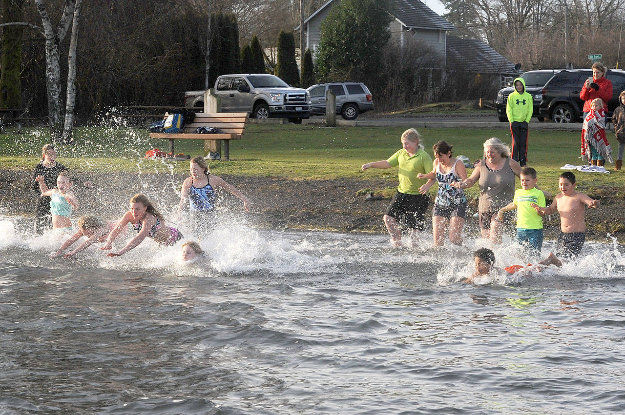 PORT ANGELES — Scores of people looking to get a chilly start to the new year dove into frigid water during polar bear dips across Clallam County on Monday morning.