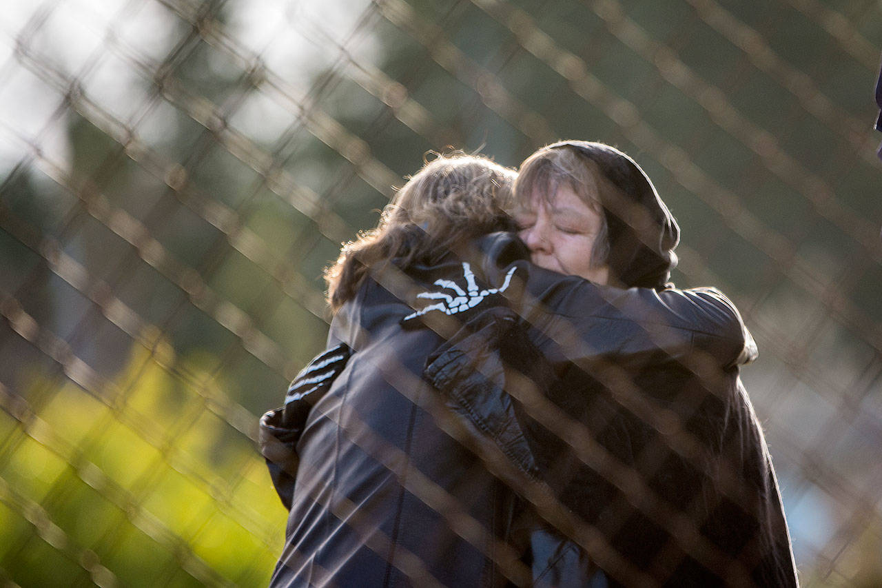PORT ANGELES — Devon Gray watched from outside Lions Park on Monday as about 75 people honored Martin Luther King Jr. and organizers spoke of the “injustice” of the city felling a sequoia and courts prohibiting Gray from going to the public park.