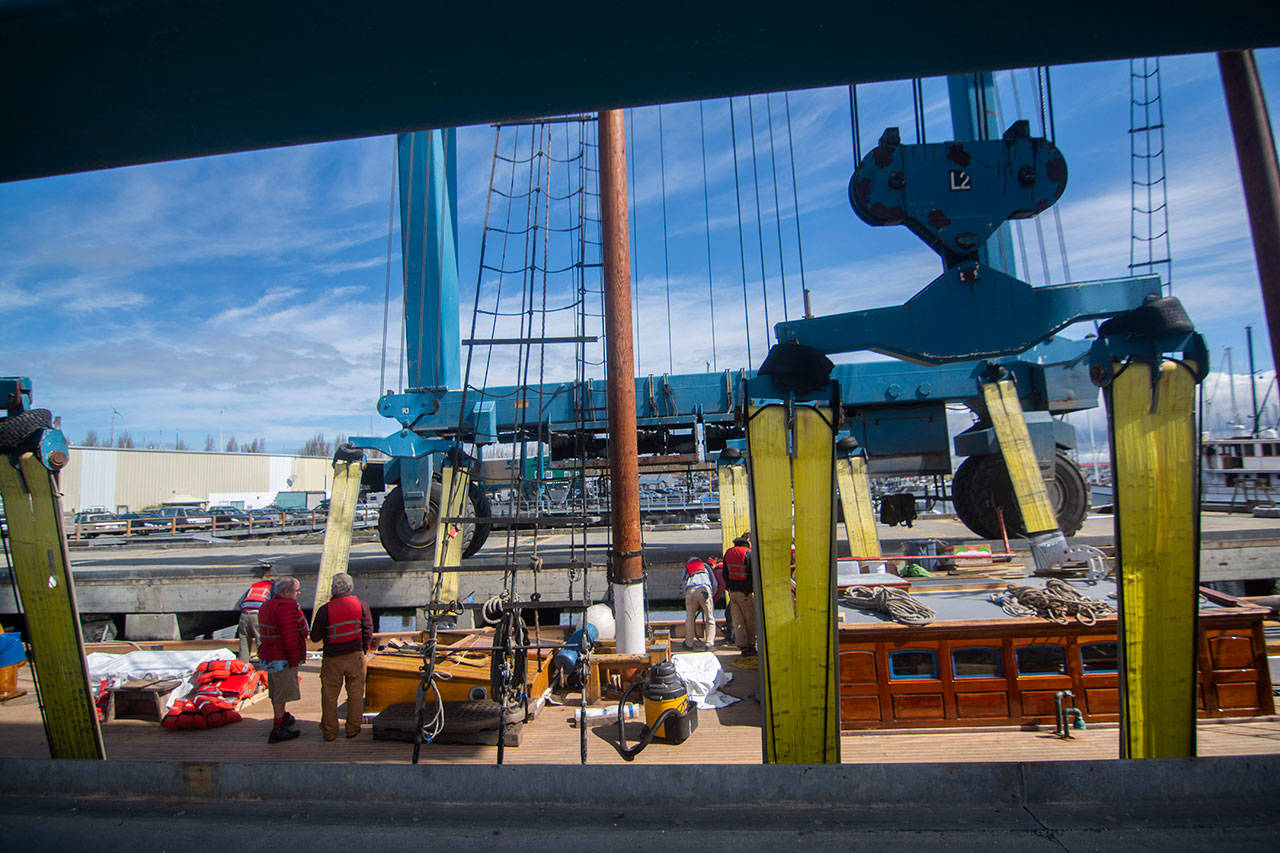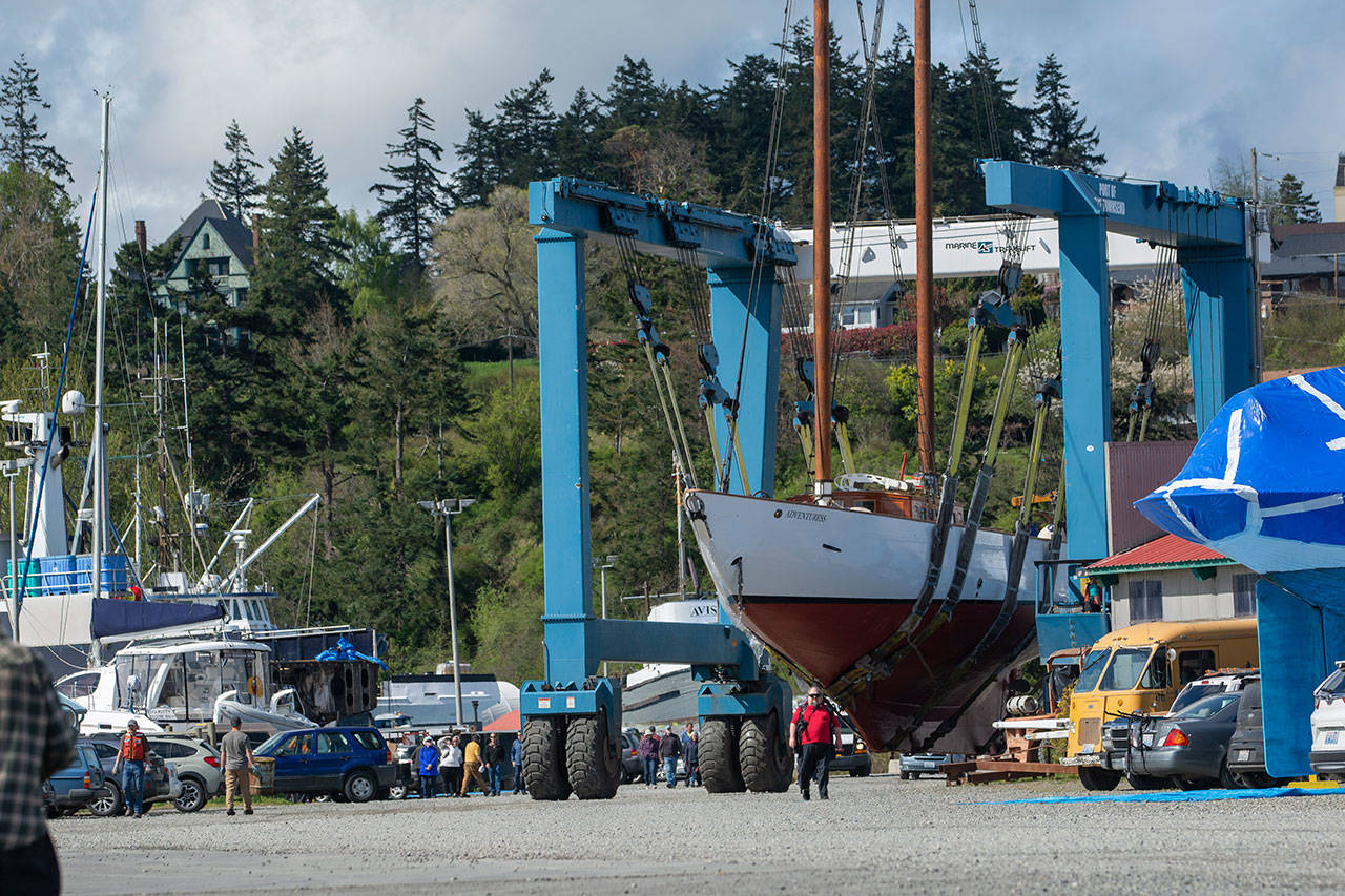 Dozens of people watched the historic 133-foot vessel as it made its way across the Port Townsend Boat Haven hanging from a 300-ton travel lift Friday morning before being lowered into the water.