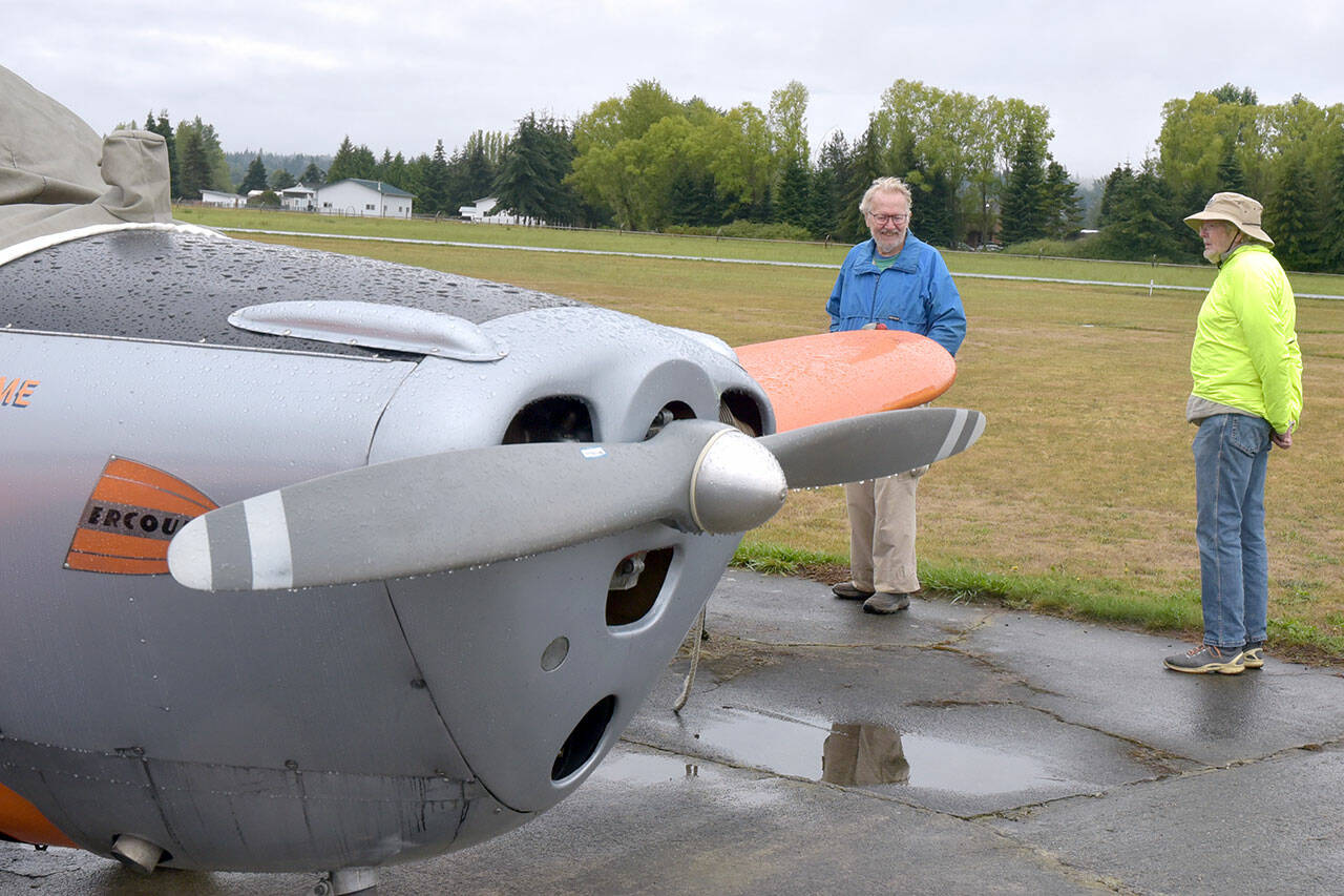Elden Hoisinger of Port Angeles, left, and his brother, Irvin Hoinsinger of Hildersheim, Germany, examine an Ercolupe 415-C airplane during Air Affaire on Saturday at Sequim Valley Airport. (Keith Thorpe/Peninsula Daily News)