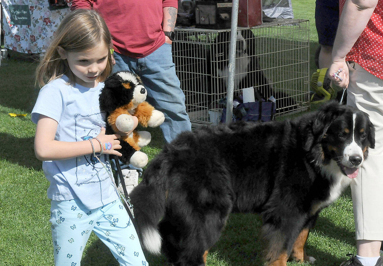 Kenna Tierney, 6, of Poulsbo, carries her stuffed Bernese mountain dog past a live version of the same breed during the 2025 AKC All-Breed Conformation Show and Obedience and Rally Trials on Sunday at Carrie Blake Park in Sequim. The three-day show, hosted by the Hurricane Ridge Kennel Club, featured hundreds of dogs from across the region in multiple rings and obedience displays. (Keith Thorpe/Peninsula Daily News)