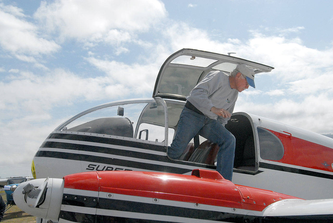 Bil Shepherd of Diamond Point steps out of his 1955 Super Aero 45 after landing on Saturday at Sequim Valley Airport. (Keith Thorpe/Peninsula Daily News)
