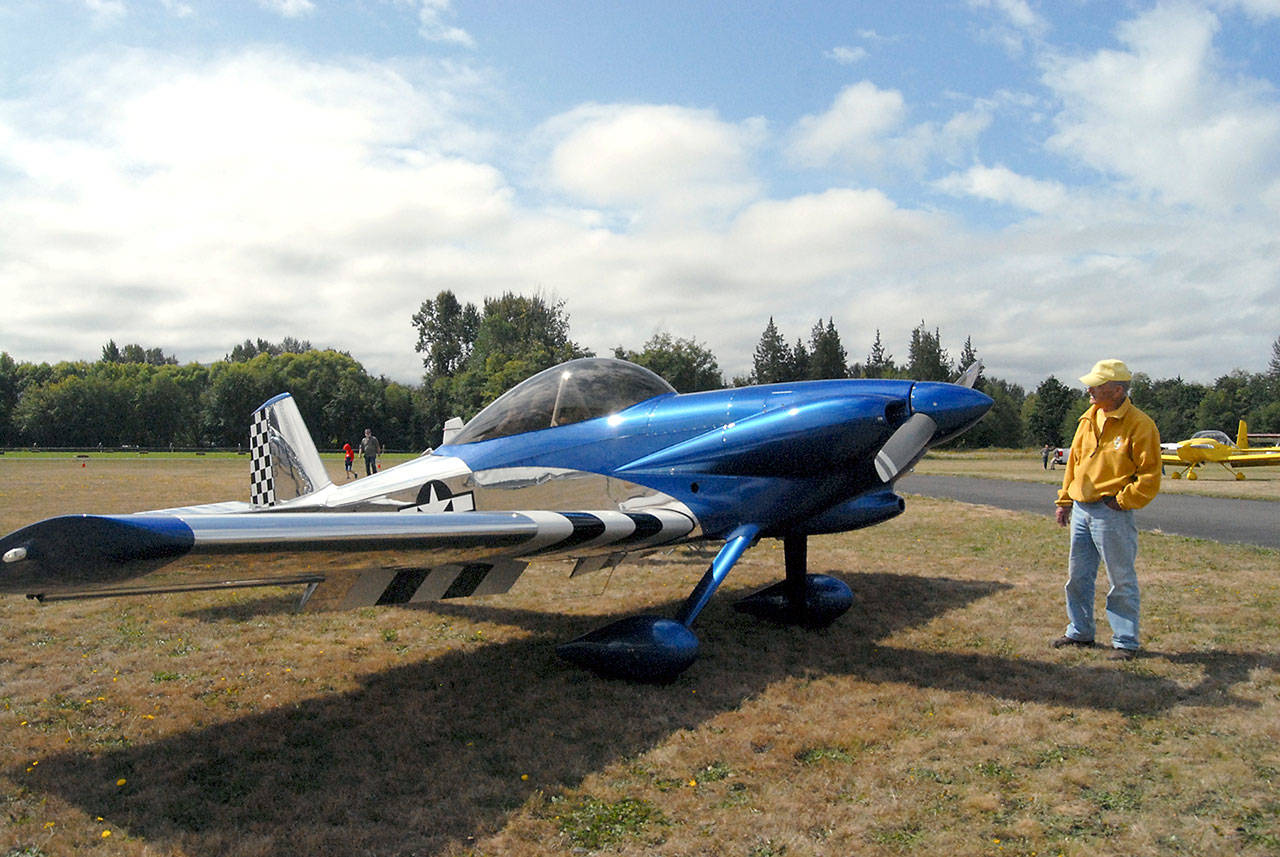 Forrest Davis of Sequim looks at a Van’s Aircraft RV-4 parked on the tarmac during Saturday’s Olympic Peninsula Air Affaire at Sequim Valley Airport. (Keith Thorpe/Peninsula Daily News)