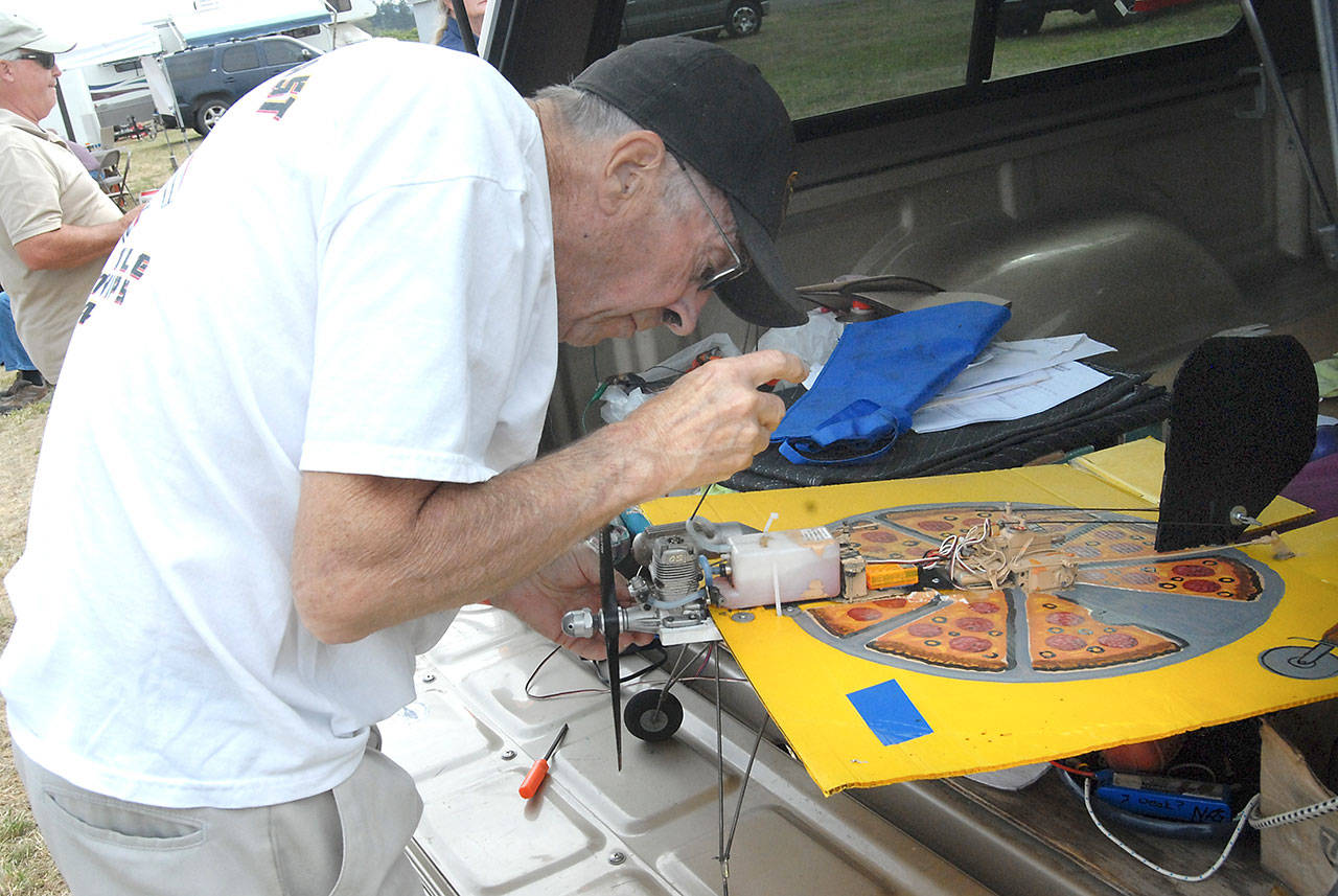Bob Walter of Port Angeles makes repaires on a novelty radio-controlled airplane make from a piece of plastic painted to look like a pizza box during a flying demonstration hosted by the Port Angeles-based Olympic R/C Modelers. (Keith Thorpe/Peninsula Daily News)