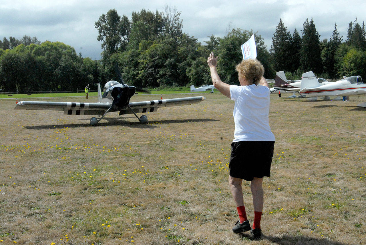 Air Affaire co-founder Emily Westcott of Sequim guides an incoming aircraft to a parking spot at Sequim Valley Airport on Saturday. (Keith Thorpe/Peninsula Daily News)