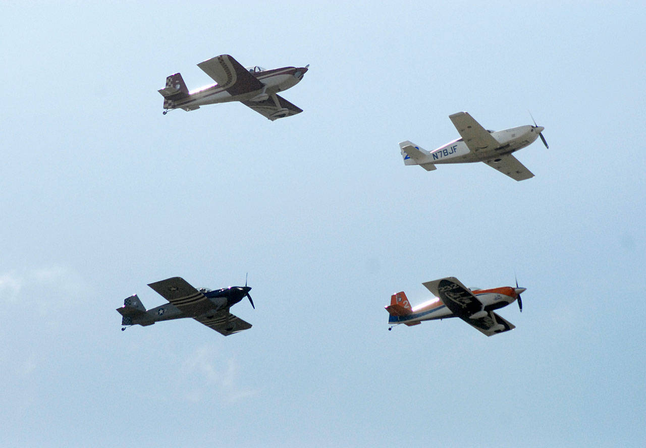 Four aircraft belonging to the Arlington-based Blackjack Squadron fly in formation above Sequim Valley Airport during Saturday’s Air Affaire and Sequim Valley Fly-In. (Keith Thorpe/Peninsula Daily News)