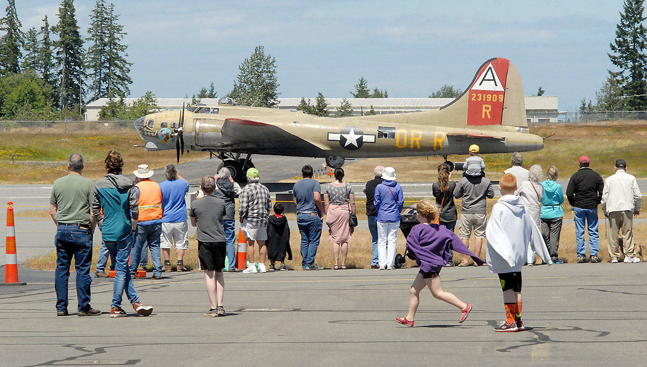 The Flying Fortress “Nine-O-Nine” looped around the Port Angeles area in a ceremonial flight as the Wings of Freedom Tour returned to William R. Fairchild International Airport for the first time since 2015.