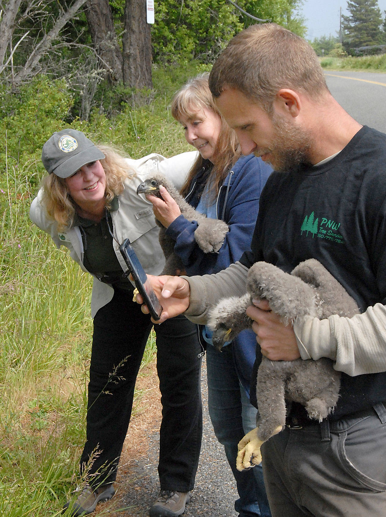 The babies apparently fell from the bald eagle nest high in the tree and Jaye Moore, the retired director of the Northwest Raptor Center in Sequim who “still dabbles” in animal rescue, worries that the baby birds will fall again.