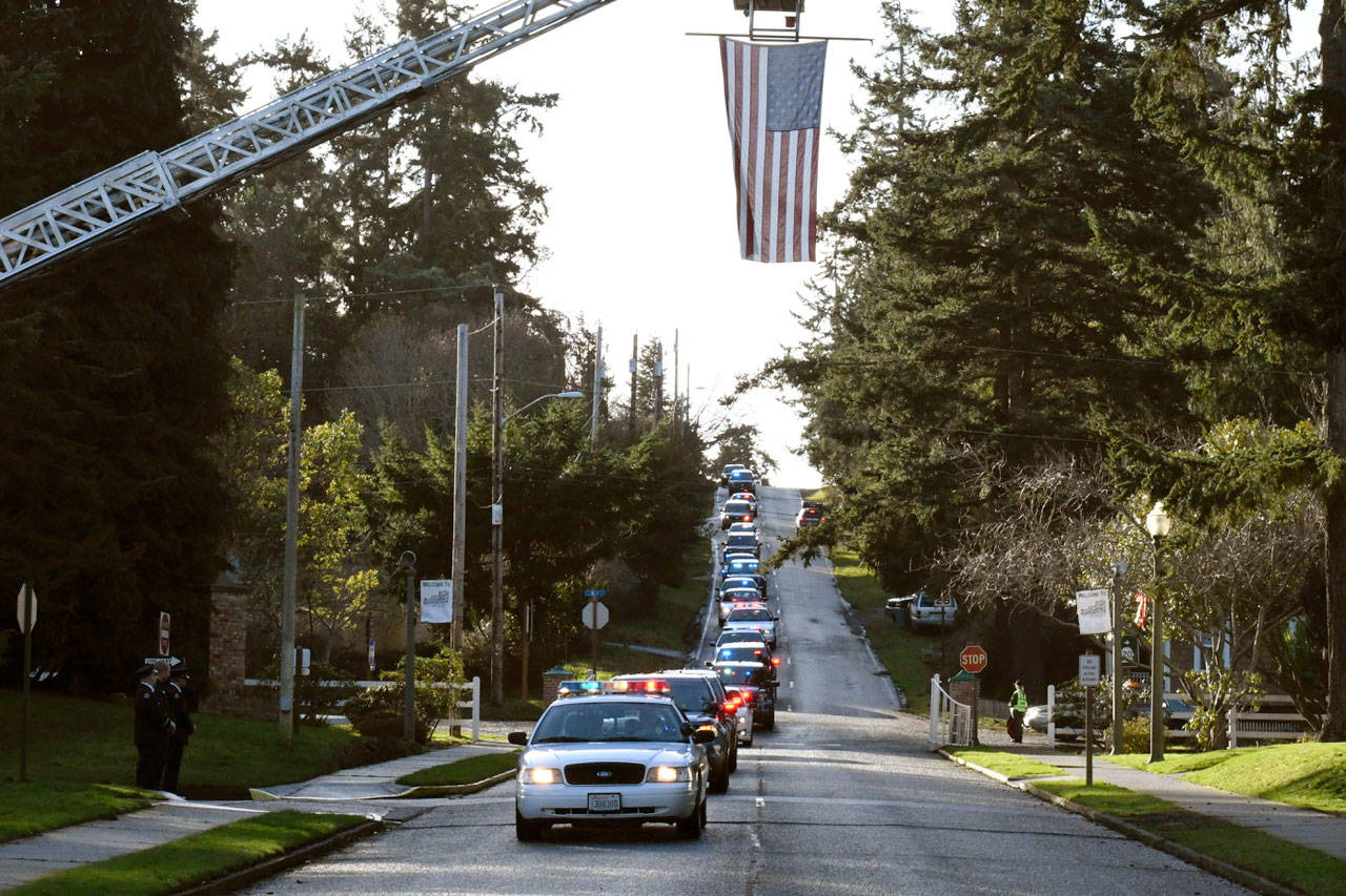 On Friday, members of the Port Townsend, Port Angeles, Poulsbo and Issaquah police departments; Jefferson County Sheriff’s Office; State Patrol; East Jefferson Fire Rescue and other service agencies formed a procession of more than 50 vehicles that made their way through the streets of Port Townsend from Haines Place, driving past the police department to Fort Worden where more than 200 people attended the two-hour memorial.