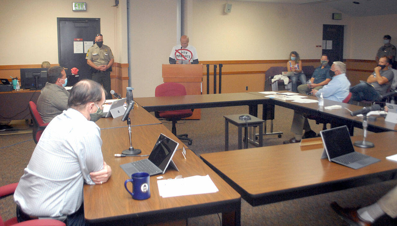 PORT ANGELES — A quieter version of the anti-Dr. Allison Berry, anti-vaccination-mandate rally on Friday at the Clallam County Courthouse occurred Tuesday during a more than three-hour public comment session in a county commissioners meeting.