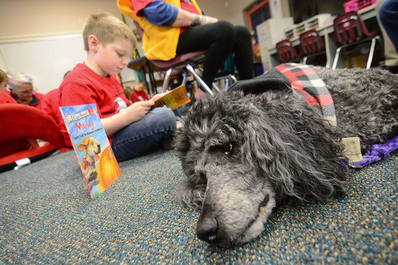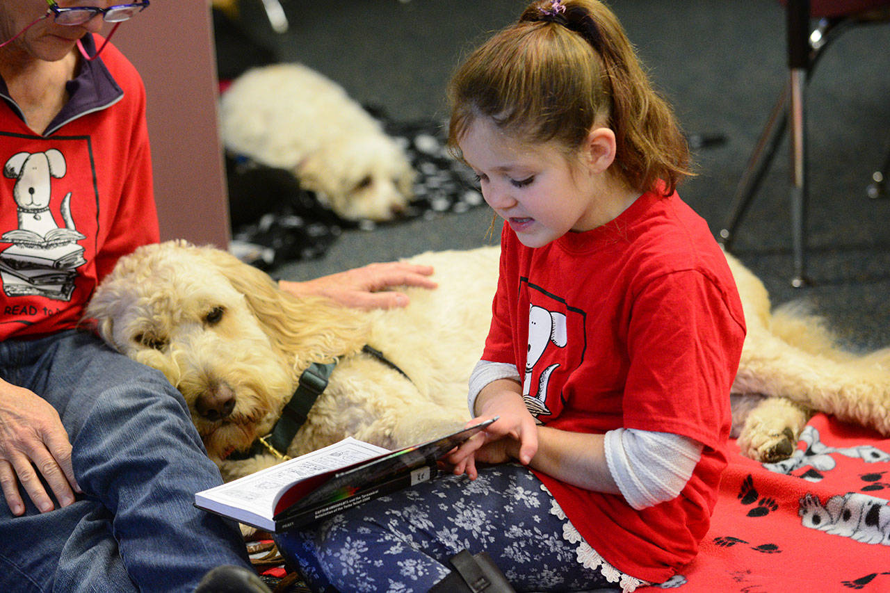 Each Friday more than a dozen certified therapy dogs and their handlers take over the school library. In four 15-minute blocks, students from second-grade classes go in, sit down next to their fluffy reading buddies and begin reading to them.