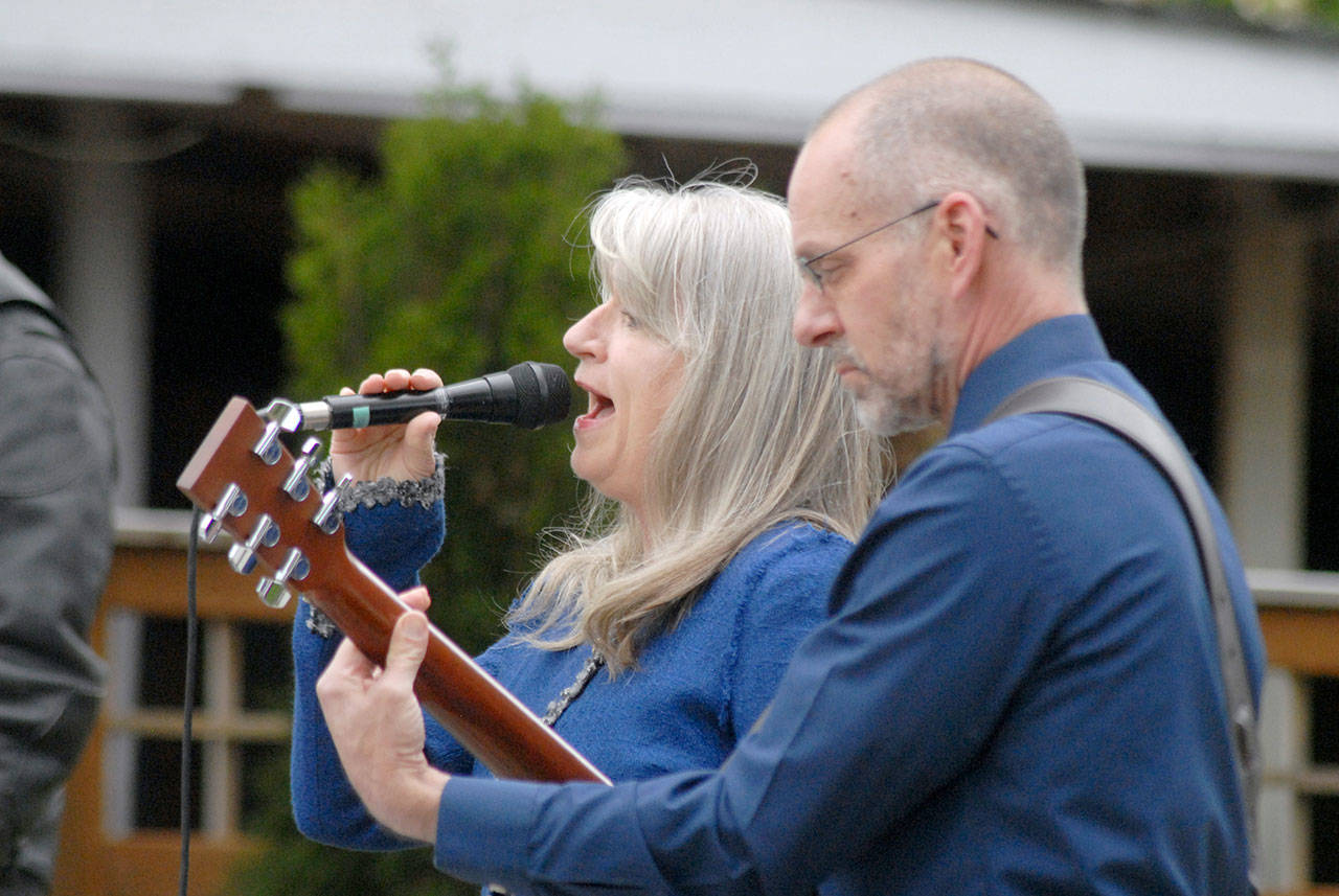 In the virtual ceremony, American Legion Riders create a flag line; Rick McKenzie plays the bagpipes; Joe Borden, vice president of the Captain Joseph House Foundation, speaks; and Port Angeles High School choir director Jolene Dalton Gailey and retired band director Doug Gailey perform “God Bless America.”