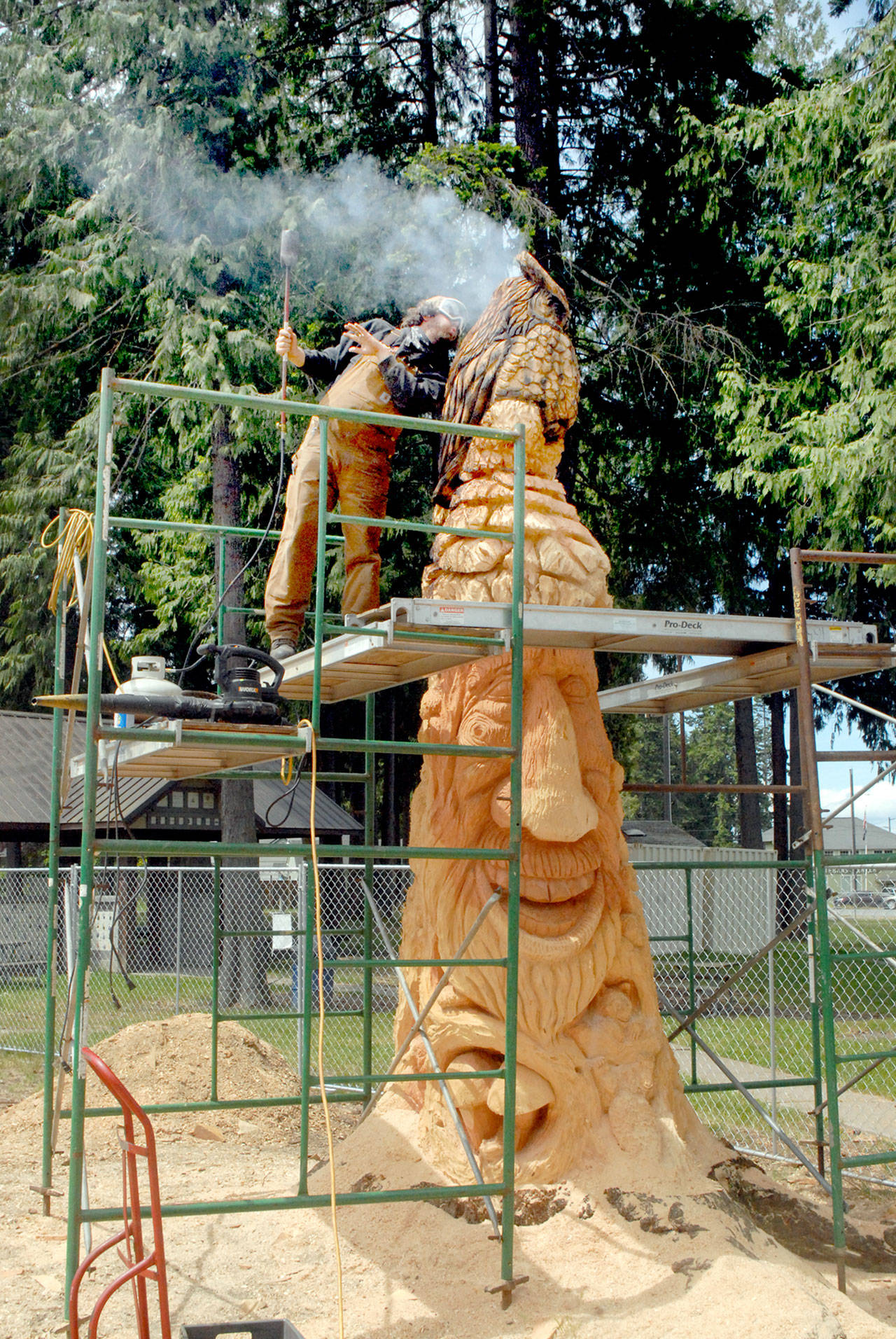 Chainsaw carvers Jeff Eshom of ButtCutt Woodworking and Nick Bielby of Nicklby Wood Carving were recruited to make the initial sculptures from the 12-foot tall remnants of two fir trees.
