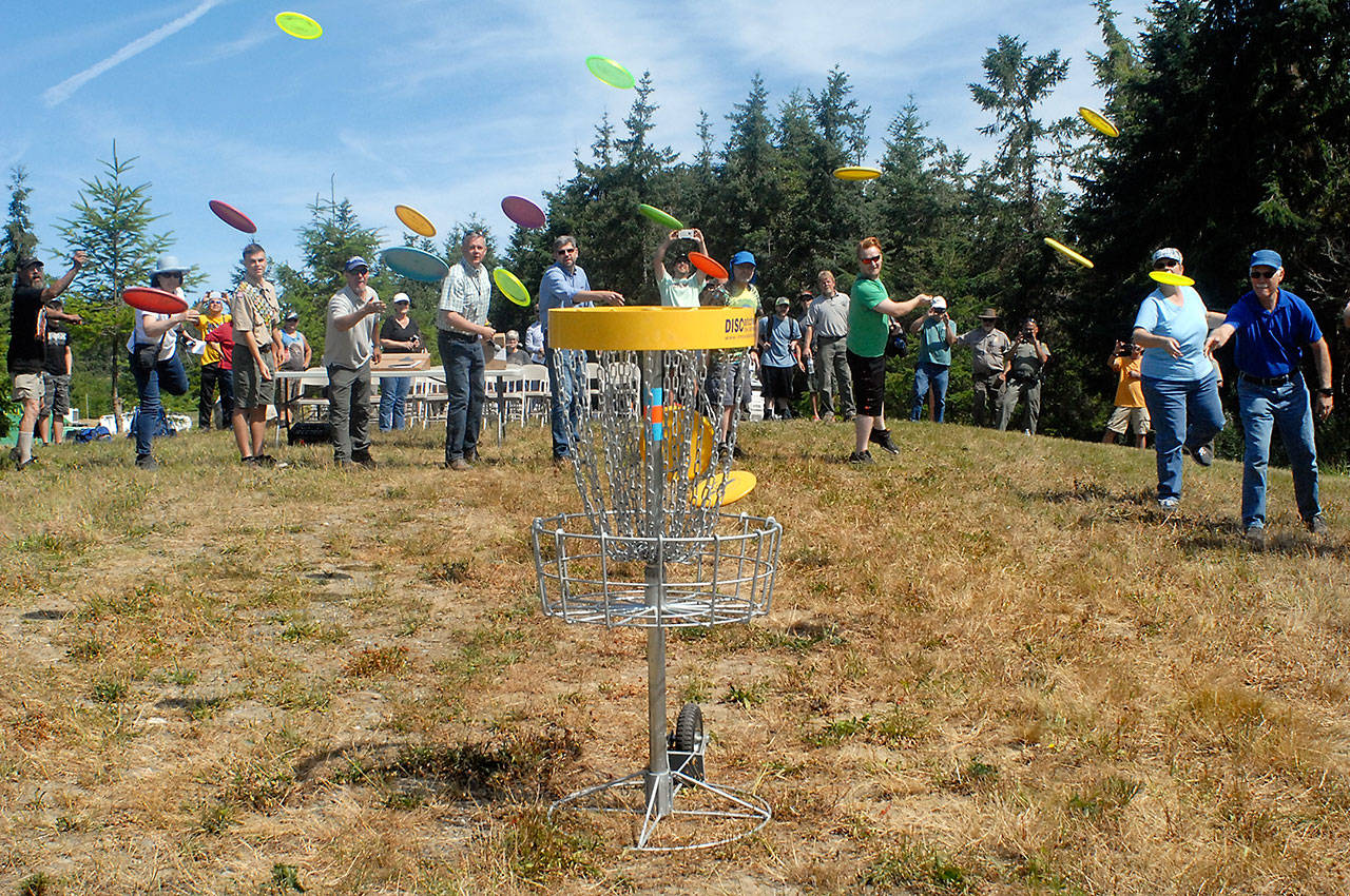Winborn, the Clallam County parks, fair and facilities director, and a group of disc golf proponents cast their plastic gliders at a metal basket Wednesday to mark the official dedication of the Rainshadow Disc Golf Park near Blyn.