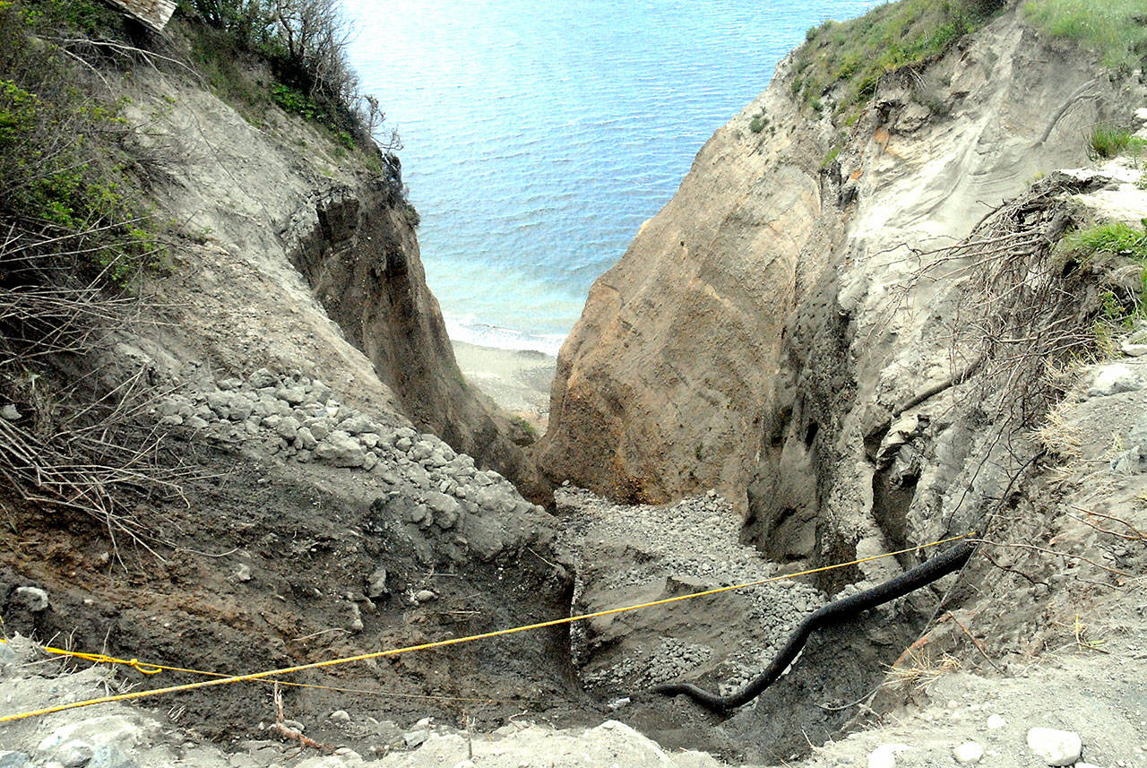 The 1960s culvert near the corner of West Bluff Drive and Juan De Fuca Way had a “Niagara Falls effect” on the upper slopes of the bluff, causing it to undercut the surrounding area, Assistant County engineer Joe Donisi said.