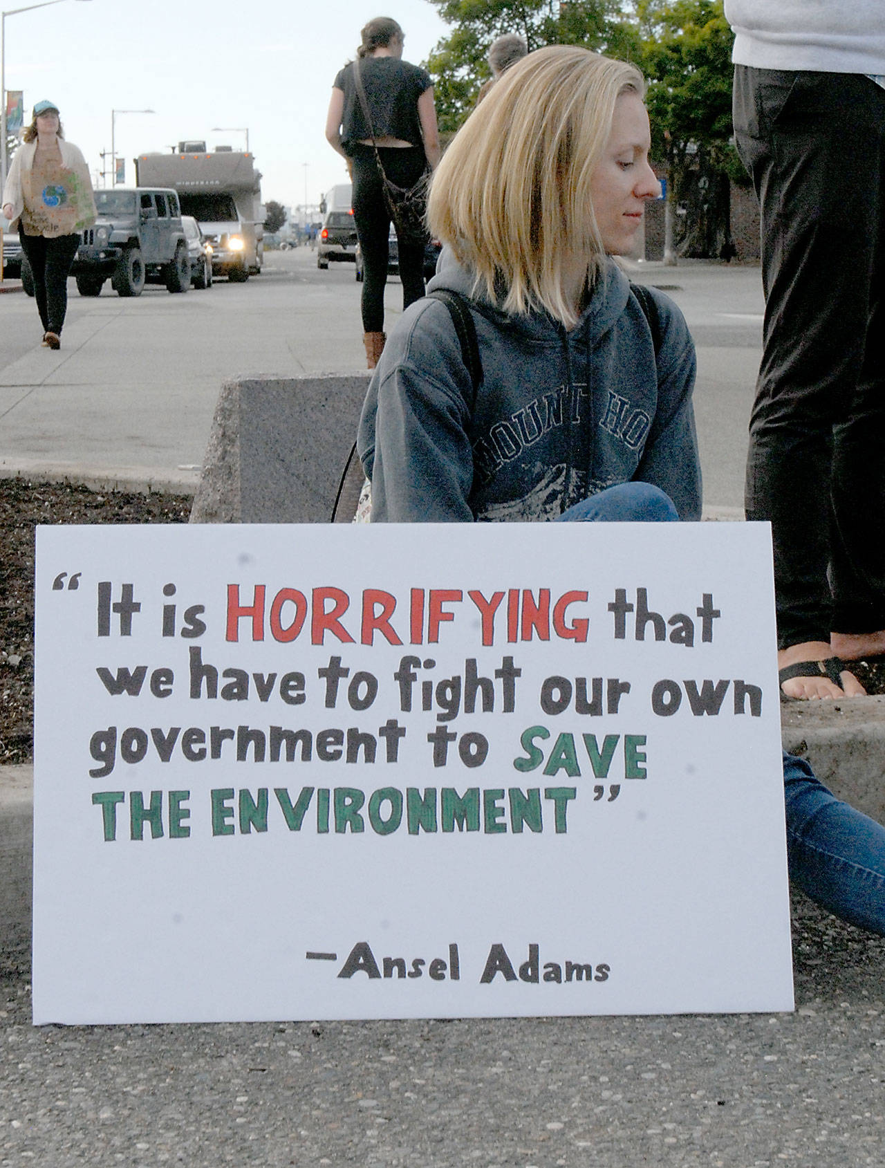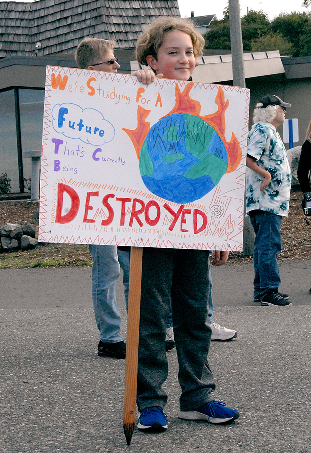 As he waited for the march to begin, 11-year-old Ewan Mordecai-Smith, a sixth-grade student at Roosevelt School in Port Angeles, held a sign warning of the destruction of the planet, a world that he would soon inherit.