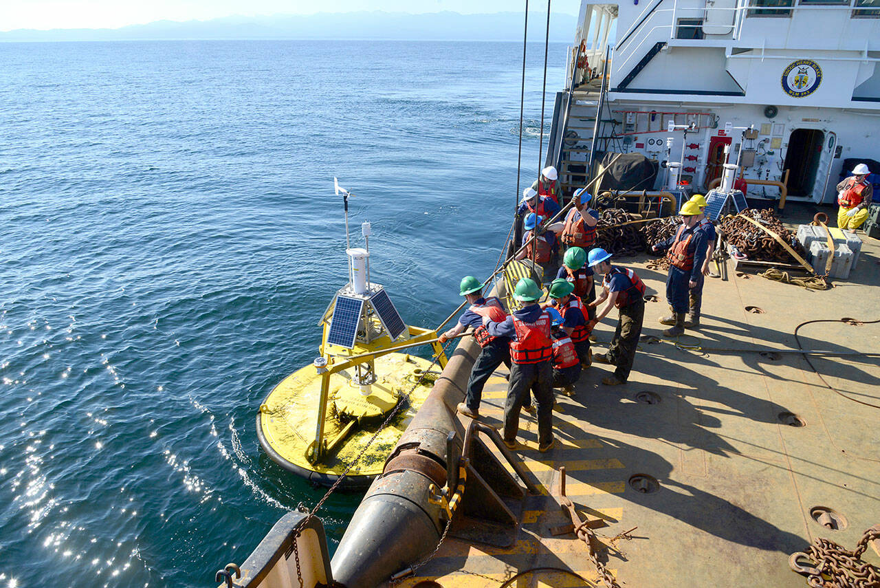 Buoy 46088 is one of more than 200 moored buoys that require annual maintenance, according to NOAA. This year, crews began servicing weather buoys along the West Coast in May, starting in San Diego, Calif., but NOAA also manages a system of tsunami warning buoys around the equator in the Pacific Ocean.