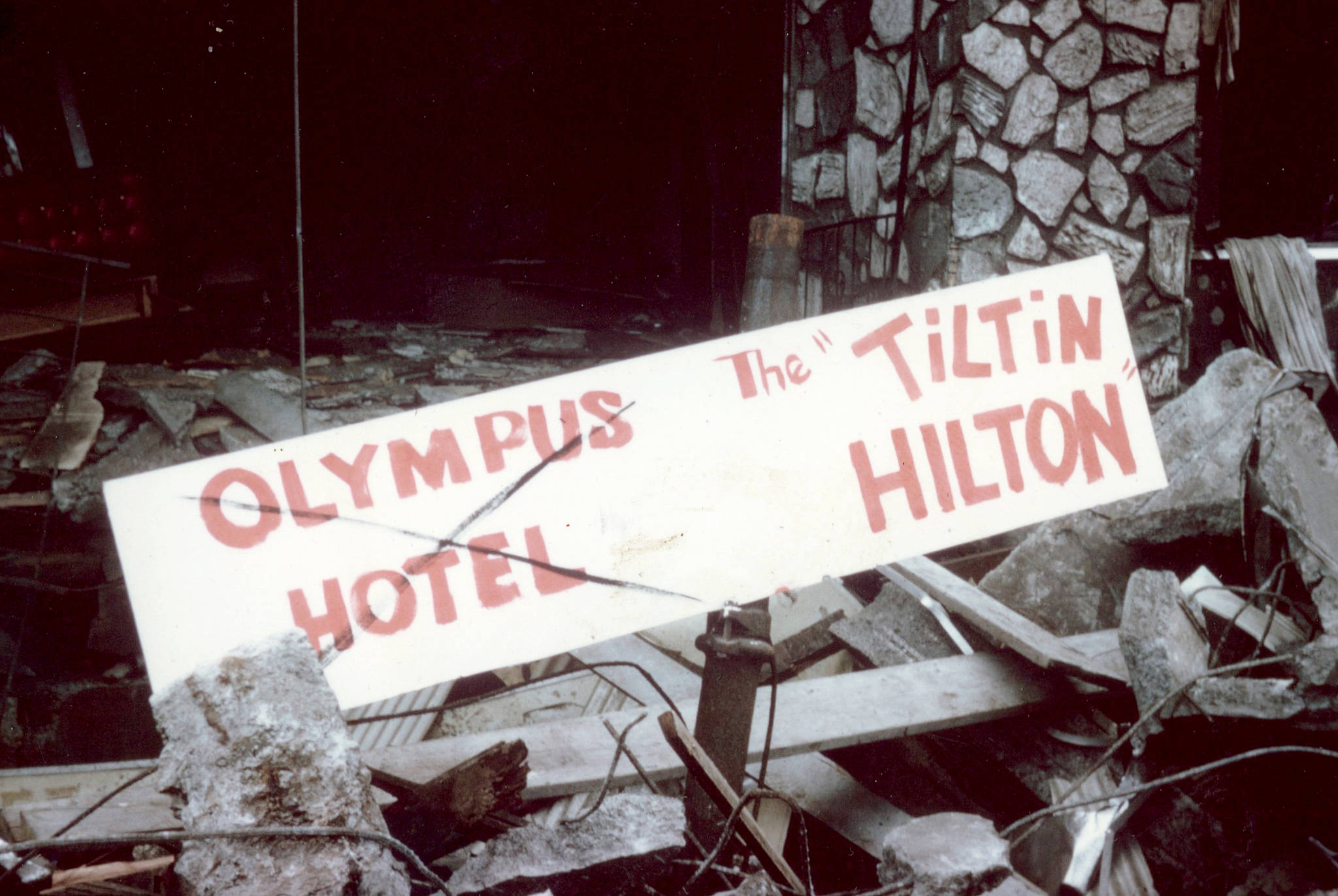 “My husband made a sign crossing out the words ‘Olympus Hotel’ to be replaced with ‘Tiltin Hilton.’