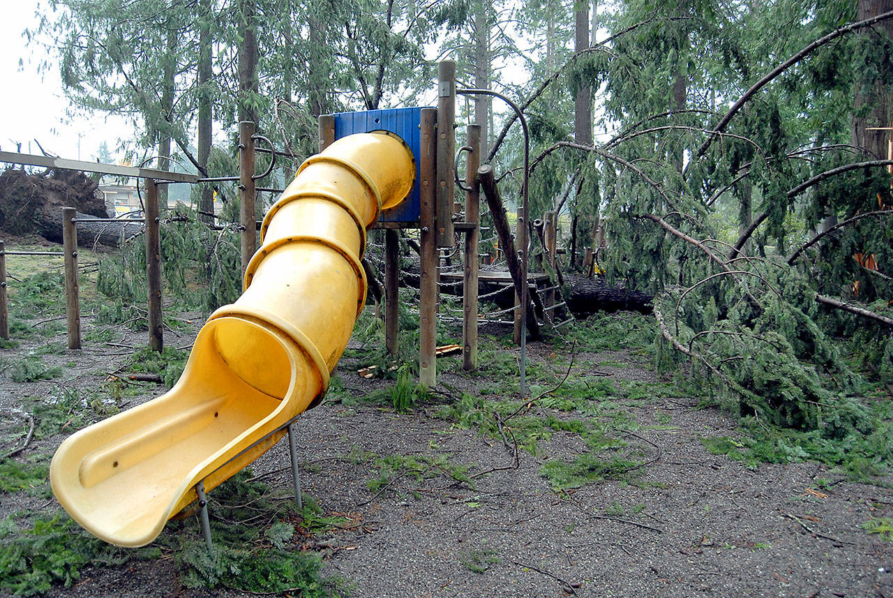 Fallen trees and branches are strewn across the wooded park and playground equipment.