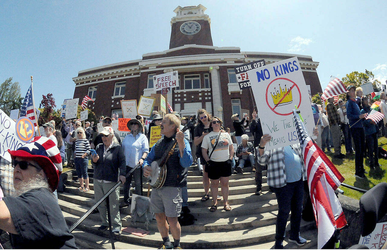 A demonstrator carrying an American flag walks the sidewalk in front of the Clallam County Courthouse on Saturday.