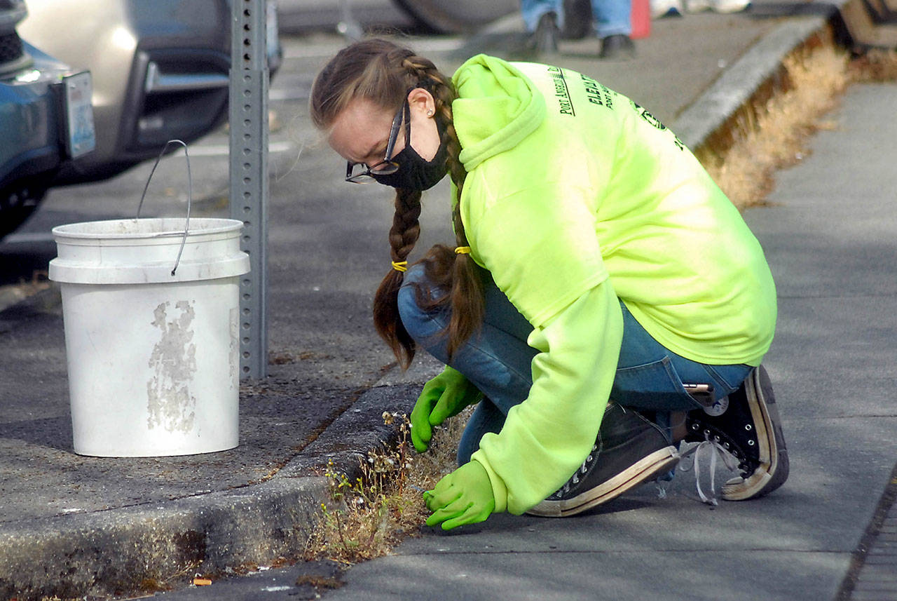 Laken Folsom, 17, student representative to the Port Angeles Parks Board, picks up weeds and intrusive grass from a sidewalk curb on Front Street in downtown Port Angeles as part of Saturday’s “Big Spring Spruce Up,’ a volunteer effort to make the downtown area more appealing. About 75 volunteers, individuals and service clubs, took part in the project.