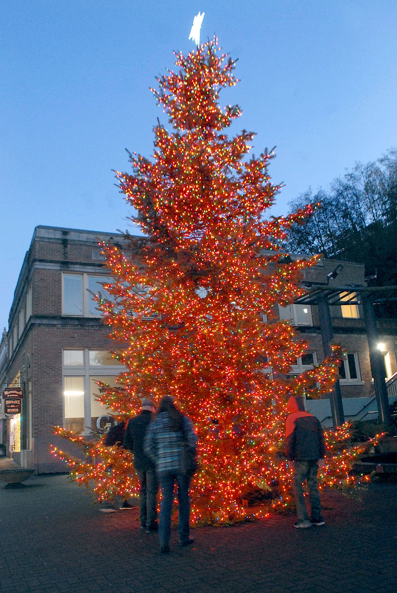 In Port Angeles, the tree donated by Jackie and John Z. Miller of Port Angeles was illuminated Saturday.