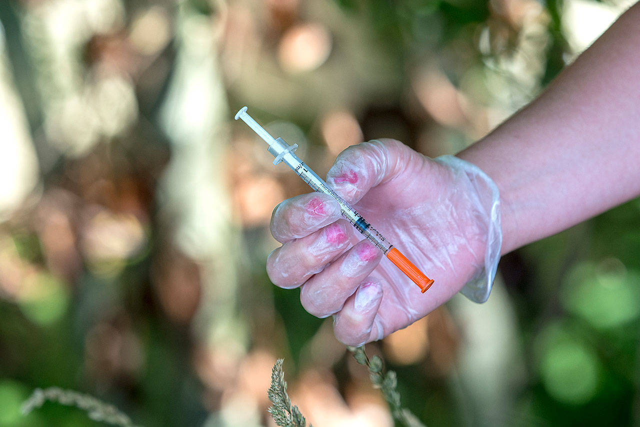In just a couple of hours the volunteers pulled enough trash to fill about 15 50-gallon bags. They found countless needle caps discarded in grassy areas at the edge of parking lots and in ravines, but only found five discarded syringes during the two-hour cleanup.
