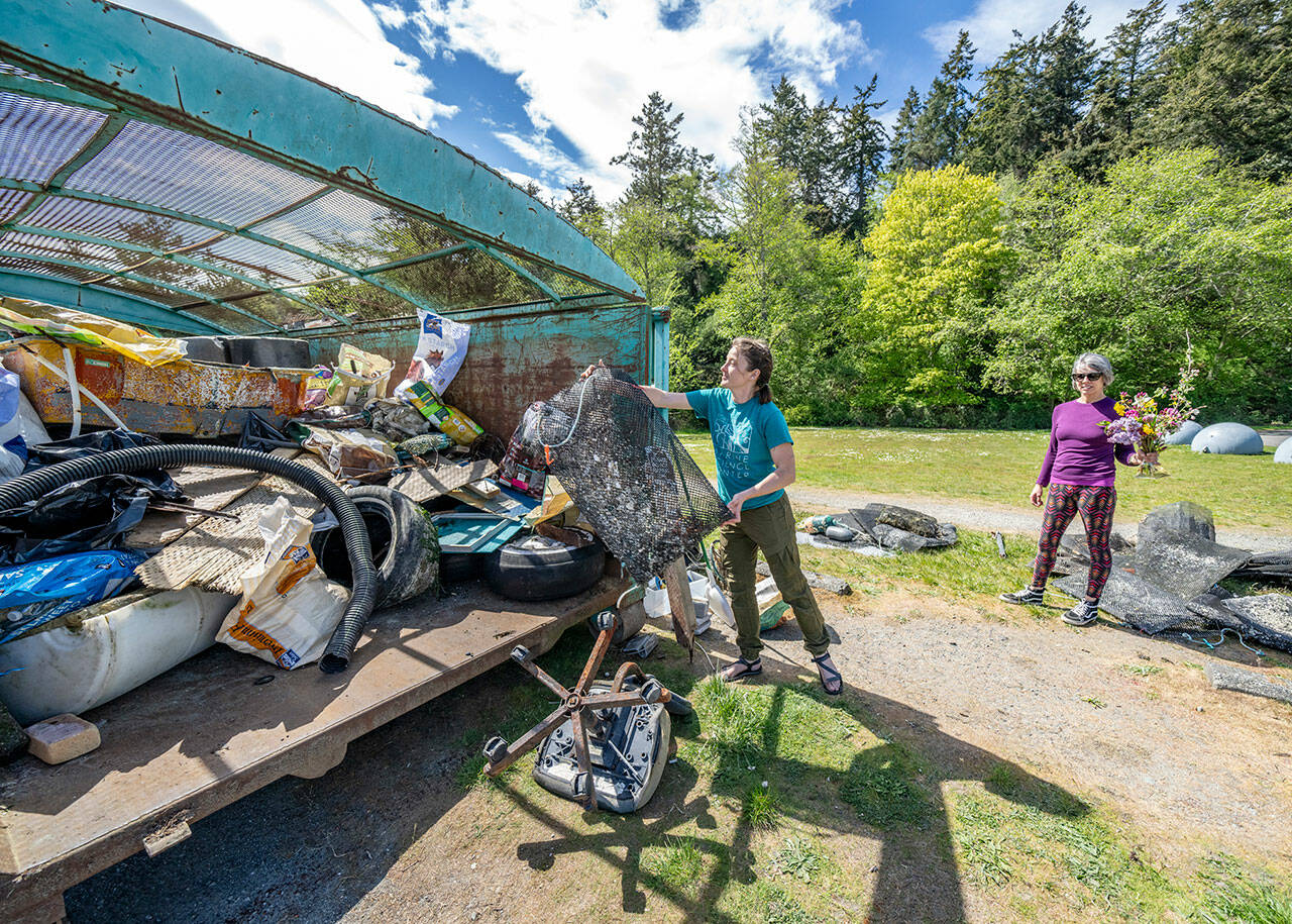 Jennifer Dine, right, of Hood River, Ore., watches as Mandi Johnson, outreach coordinator for the Marine Science Center in Port Townsend, throws additional debris into a dumpster for later removal to a landfill. The debris came from the Hood Canal Bridge, Discovery Bay, Cape George, Port Townsend and Port Hadlock areas of Jefferson County during an Earth Day beach cleanup event on Saturday.