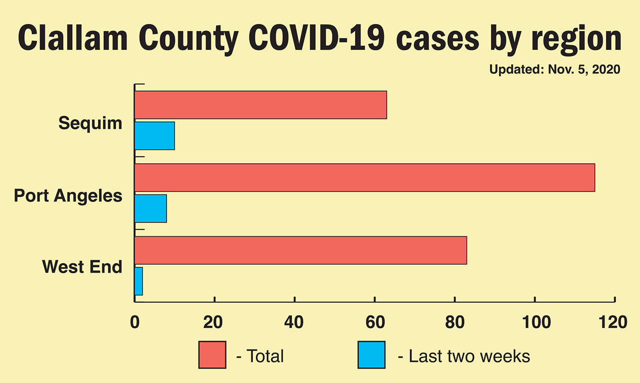 Clallam County Health Officer Dr. Allison Unthank said the five new cases Saturday were all household contacts of other recent cases. The infection rate was listed Saturday at 26 per 100,000 over the past two weeks. There are currently 16 active cases in Clallam County.