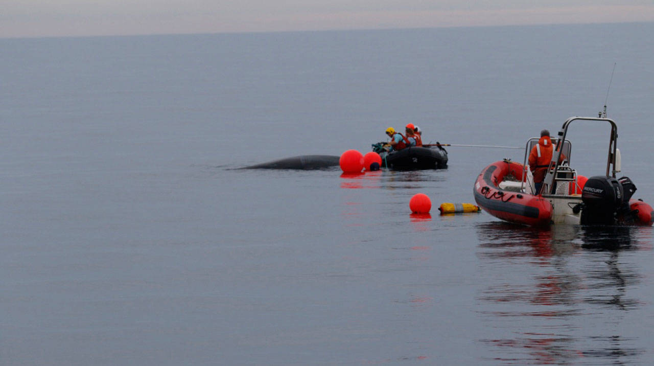 The response team included members from SR3: Sealife Response, Rehabilitation, and Research; Cascadia Research Collective; the Makah Tribe; the state Department of Fish and Wildlife; and World Vets. Response teams must complete extensive training and work under a NOAA Fisheries permit because disentangling large whales can be difficult and dangerous, the press release stated.