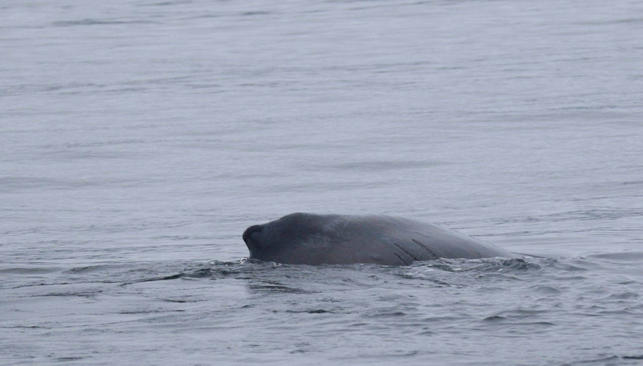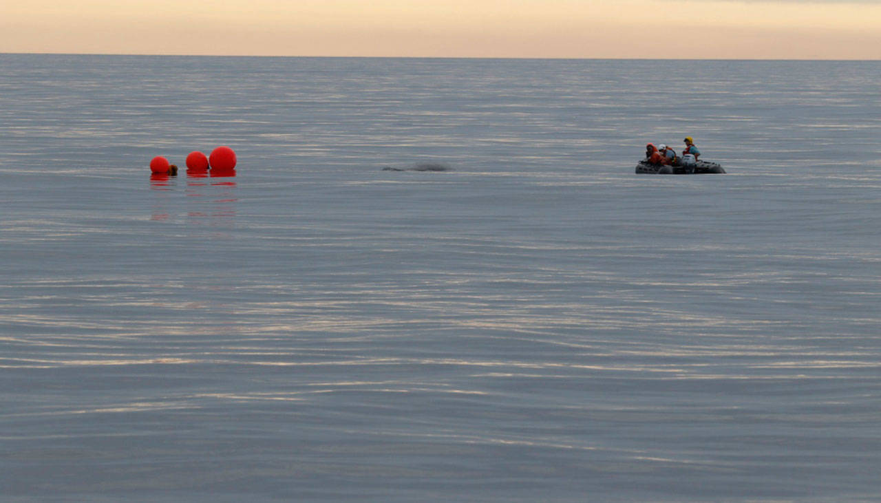 The entangled whale off the tip of the Olympic Peninsula was first reported just before noon last Thursday by Todd’s Extreme Fishing, which stayed with the whale to monitor its location until the Makah Tribe and U.S. Coast Guard arrived to take over the watch.