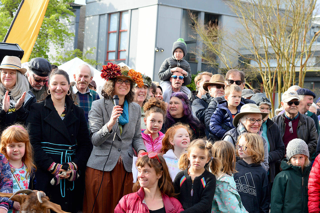 Jefferson County Farmers Markets director Amanda Milholland welcomes a throng of people to opening day of the Port Townsend market on Saturday. Dozens of vendors and hundreds of shoppers converge on the 600 block of Tyler Street for the event, which returns this Saturday from 9 a.m. to 2 p.m. (Diane Urbani de la Paz/Peninsula Daily News)