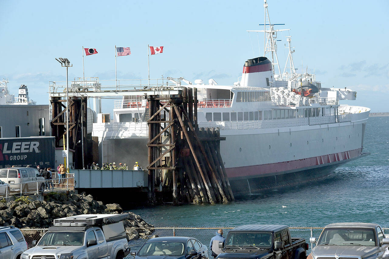 The fire began Thursday afternoon as the vessel approached the Port Angeles dock on the first of the Coho’s three-trip sailing schedule.