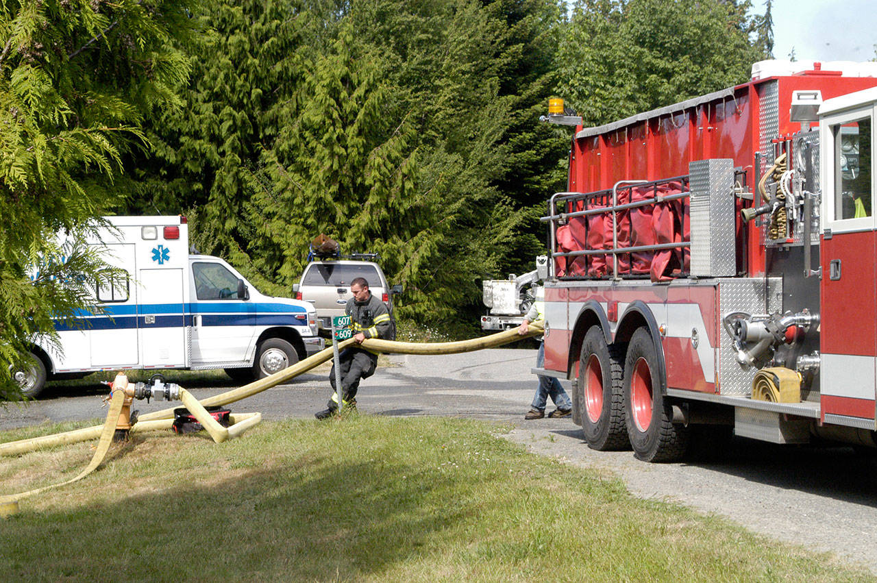 The Clallam County Sheriff’s Office established a road block on the 600 block of Lake Farm Road to allow water tenders to safely maneuver along narrow roads. Water was being shuttled from a nearby hydrant to the scene.