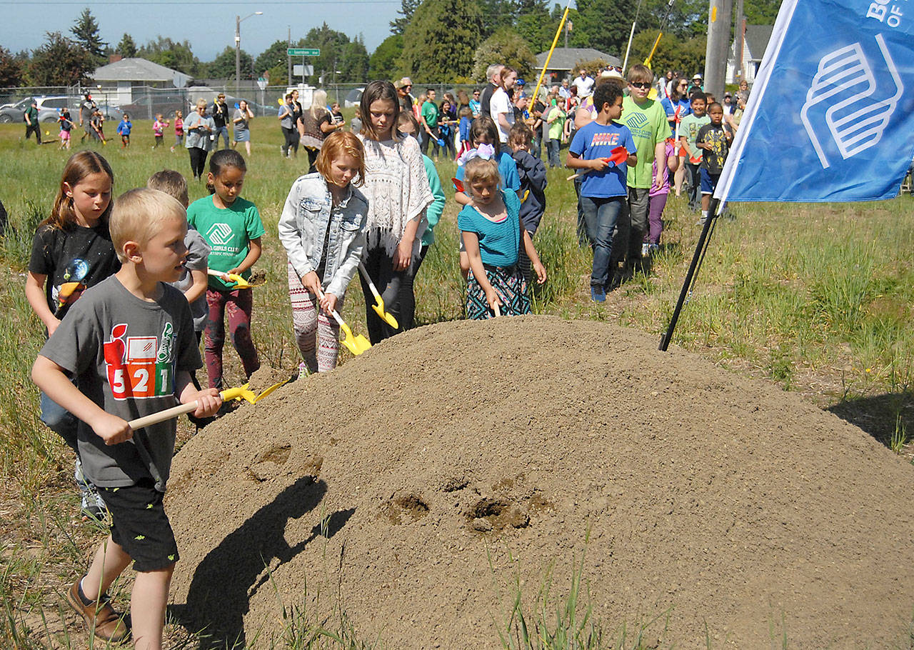 The boys and girls who give purpose to the Boys & Girls Clubs of the Olympic Peninsula carried the small red, white, blue and green shovels past more than 100 well-wishing adults at the Lauridsen Boulevard-Francis Street site.
