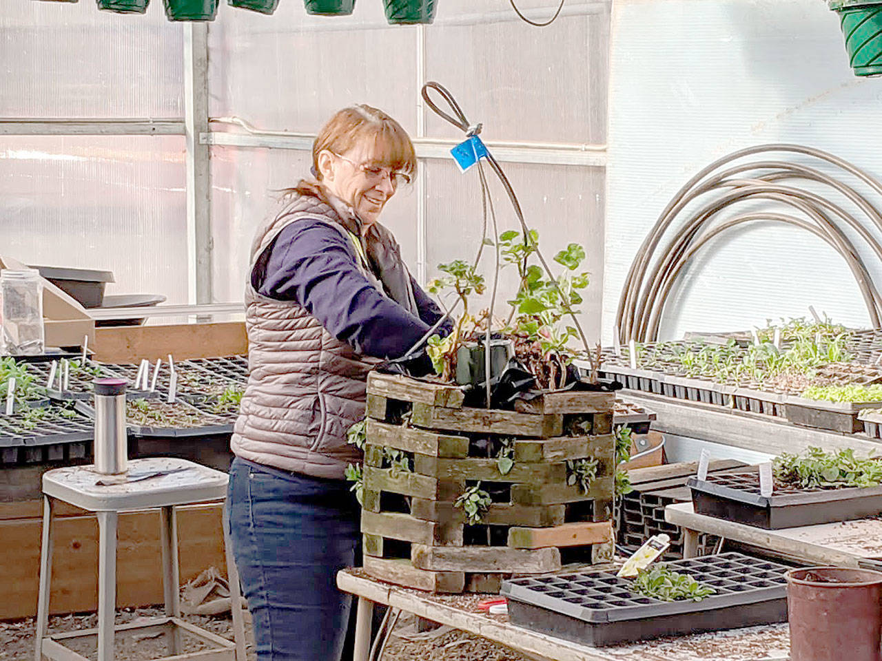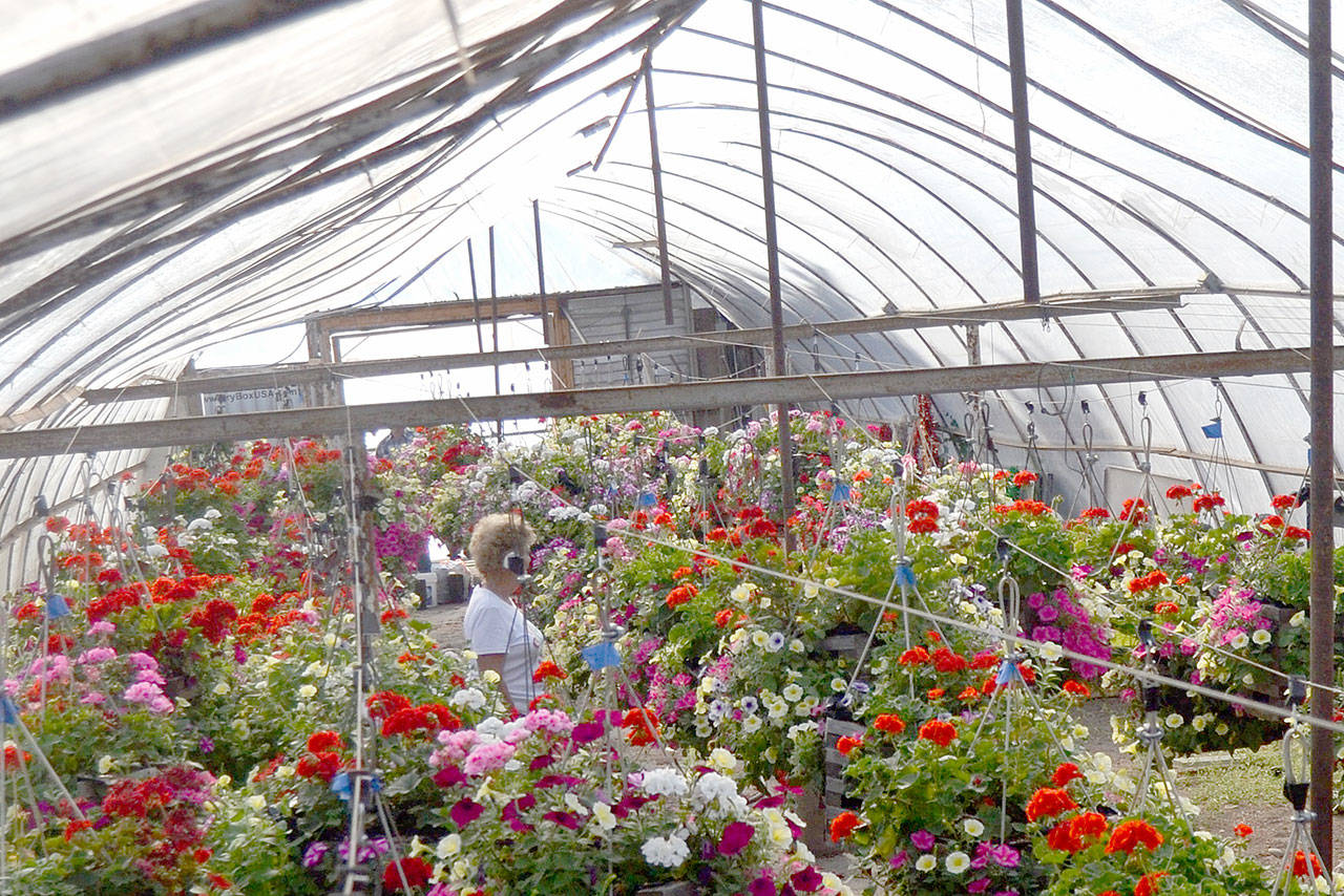 McFarlen said organizers are seeking grants to replace the greenhouse on the City of Sequim’s property off South Second Avenue because snow warped the ceiling of the 1960s structure last winter. Completed flower baskets are stored in the greenhouse each year prior to going out on city streets.