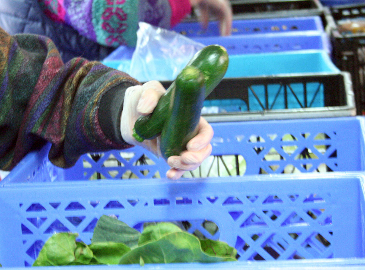 Farther down the line, Sandra Largaespada of Food Lifeline joined Tri-Area volunteer Barbara Smith. With protective gloves on their hands, they provided clients with beets, arugula, cabbage and mushrooms.
