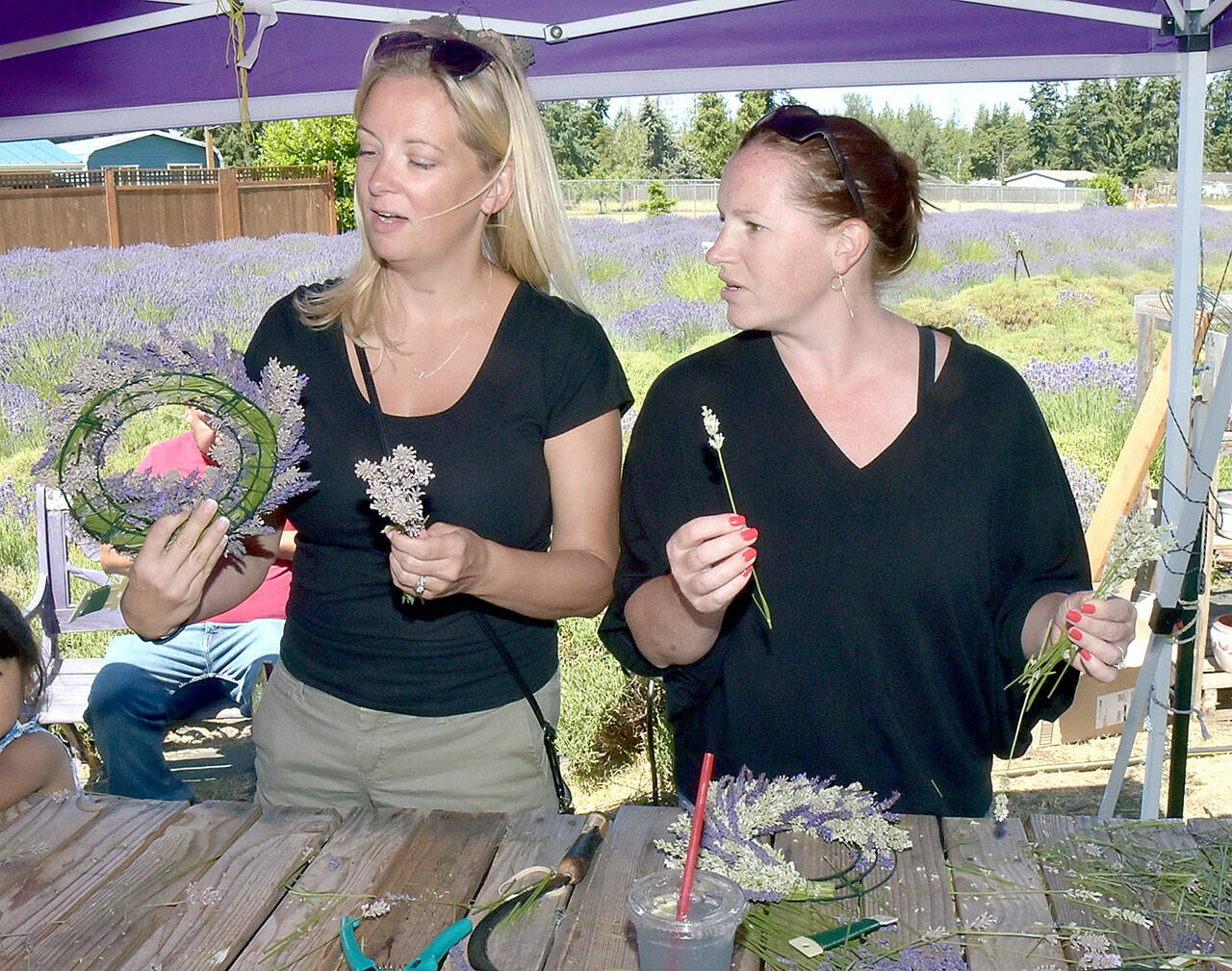 Crystal Heap of Lynden admires a lavender bouquet as her daughter, Lillian, 6, looks on at Old Barn Lavender Company near Sequim on Saturday, part of Sequim Lavender Weekend.