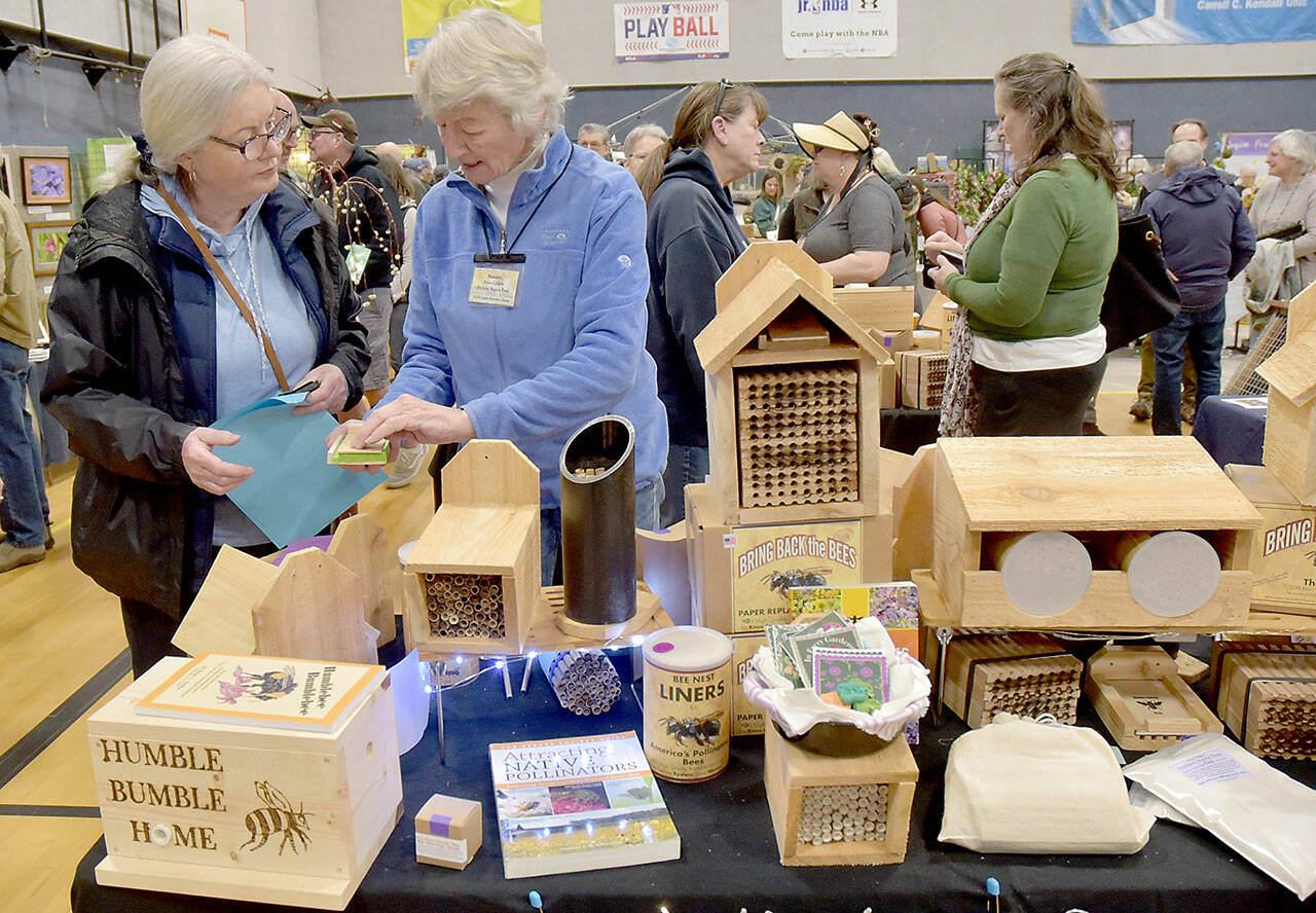 Jan Patterson of Port Angeles, left, learns about pollinating insects from Maureen Morlang of Bremerton-based Knox Cellars Mason Bees at the 26th annual Soroptimist Gala Garden Show at the Sequim Boys & Girls Club. The event on Saturday featured numerous display and vendor booths devoted to plants, gardening and outdoor activities, as well as a slate of guest speakers and workshops. (Keith Thorpe/Peninsula Daily News)
