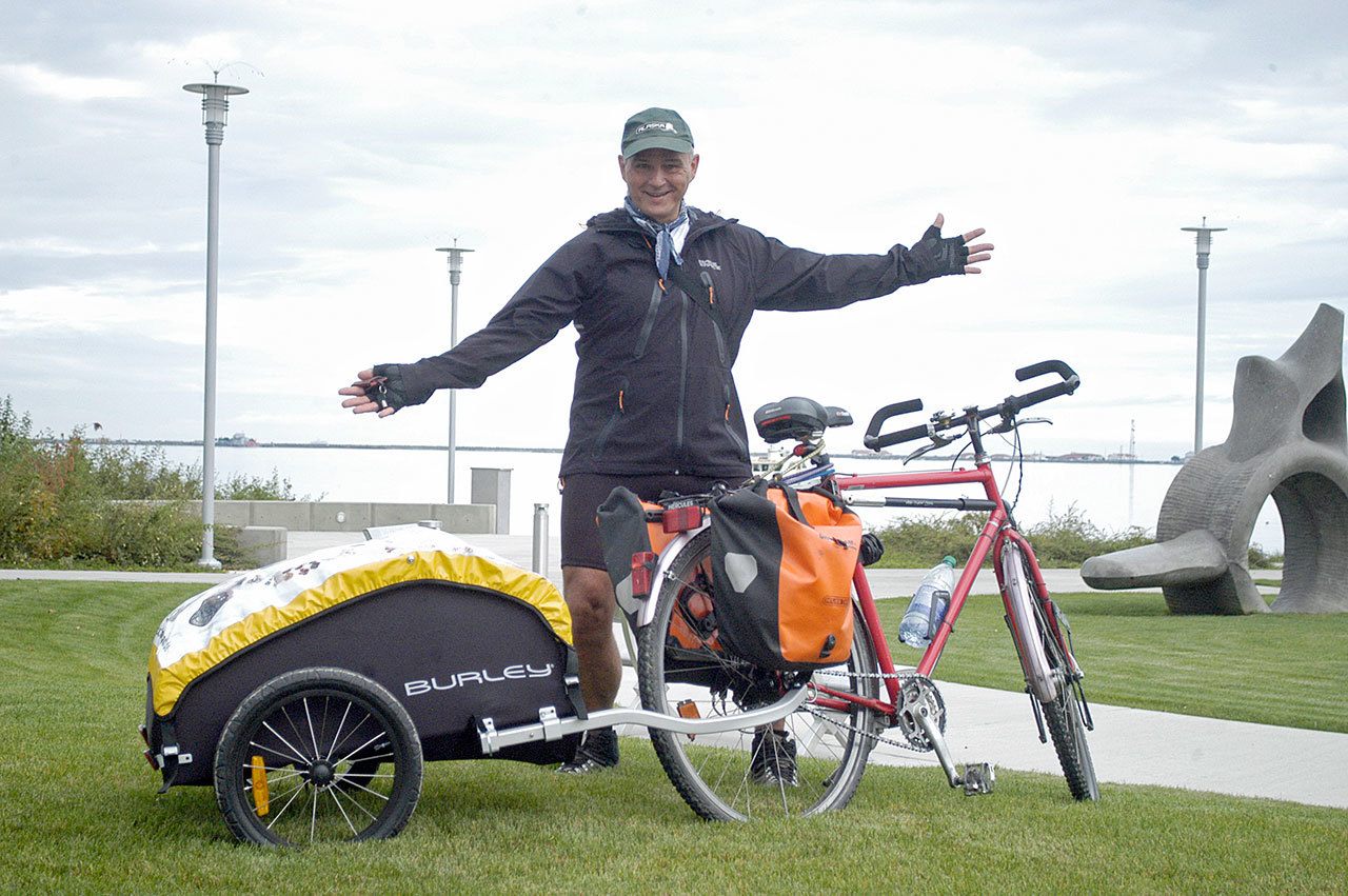 Klaus Lüttgen, 57, of Cologne, Germany, said he started in Vancouver on Aug. 26 and arrived in Port Angeles on Monday via ferry from Victoria. He expects to arrive in Forks today and to reach San Francisco on Oct. 6.